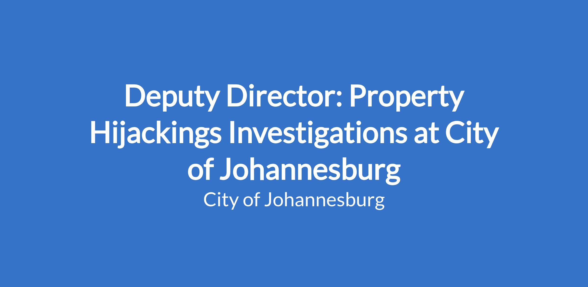 The Deputy Director: Property Hijackings Investigations reports to the Director: Property Hijackings Investigations and is responsible for the implementation and monitoring strategies, policies, procedures and response plans regarding the investigations of property Hijackings, non-compliance with applicable legislation, including facilitation of taking legal action against the perpetrators for successful prosecution in order to curb the challenges related to hijacked properties.