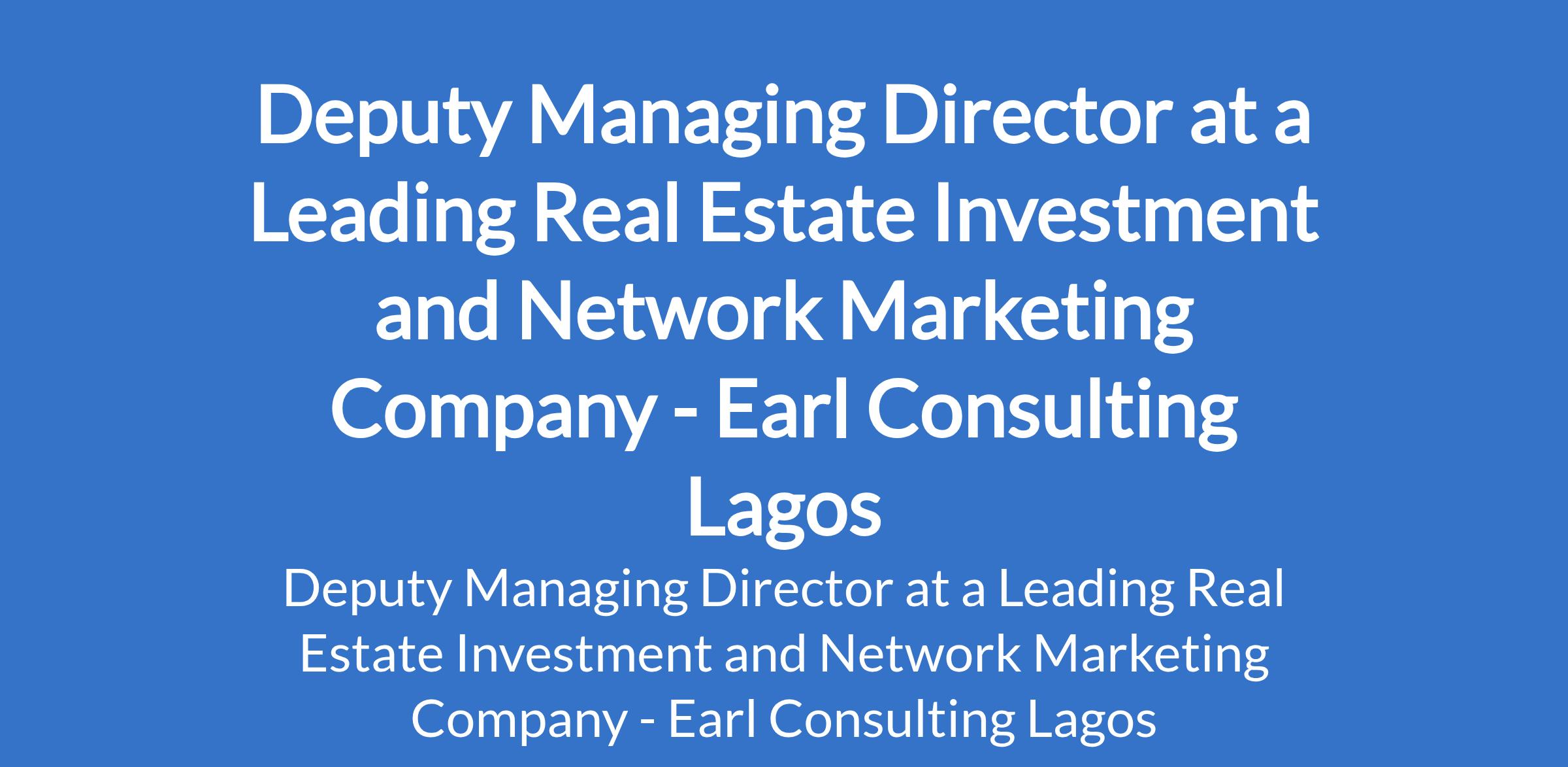 Earl Consulting Lagos - Our client, a leading real estate investment and network marketing company is recruiting to fill the position of: Deputy Managing Director. The position is located in Victoria Island, Lagos State. Interested candidates should possess a Degree in Real Estate Management, Business Administration, or related fields with 10+ years in real estate, construction, or asset management.
