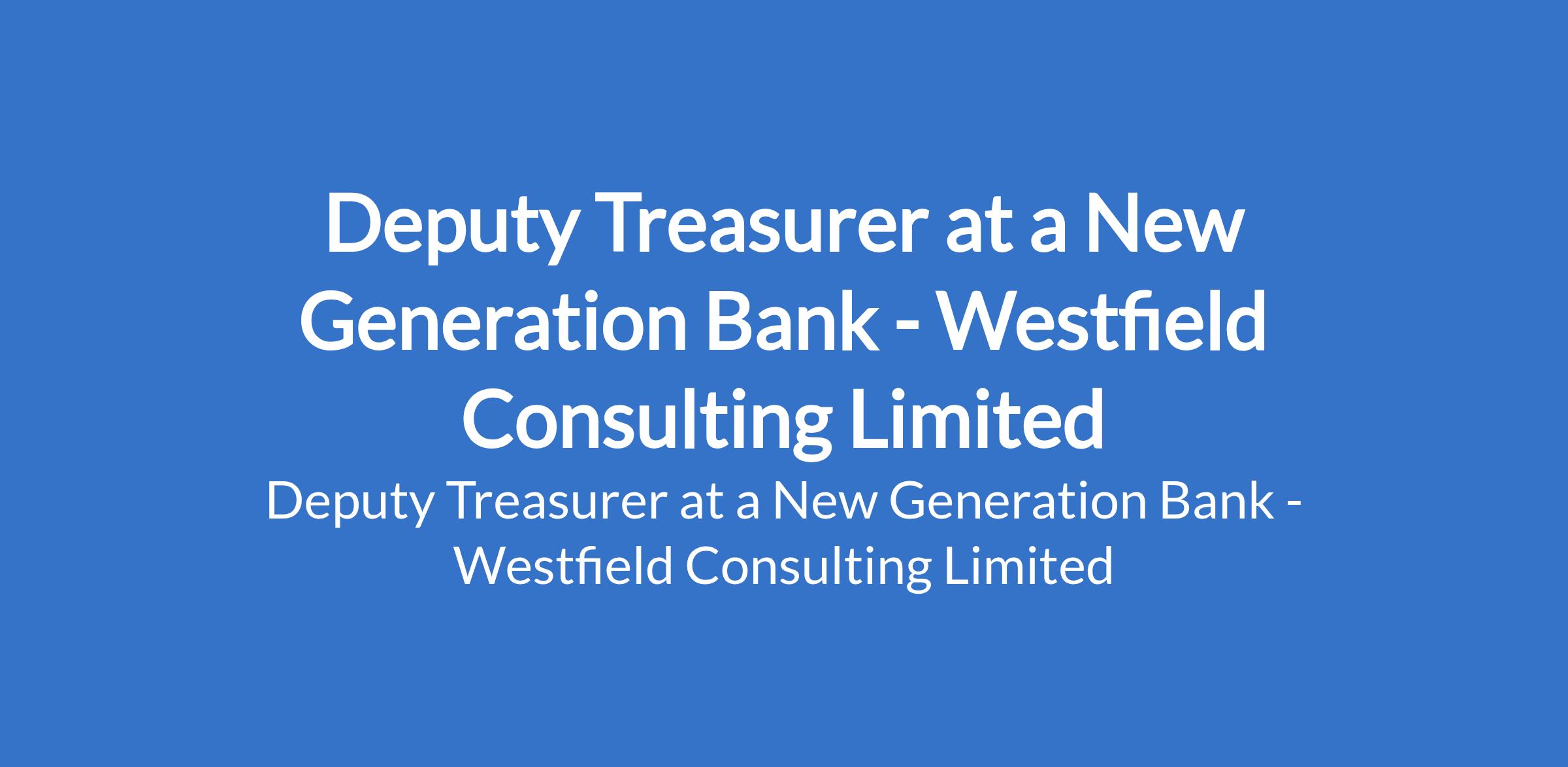Westfield Consulting Limited - Our client, a New Generation Bank is recruiting to fill the position of: Deputy Treasurer. The position is located in Lagos, State. Interested candidates should possess a First Degree in Finance, Accounting, Economics, or a related discipline with a minimum of 8 years experience in treasury or financial markets, with at least 3 years in a managerial role; Professional qualification (ACA, ACCA, CFA, ACT) is an added advantage.