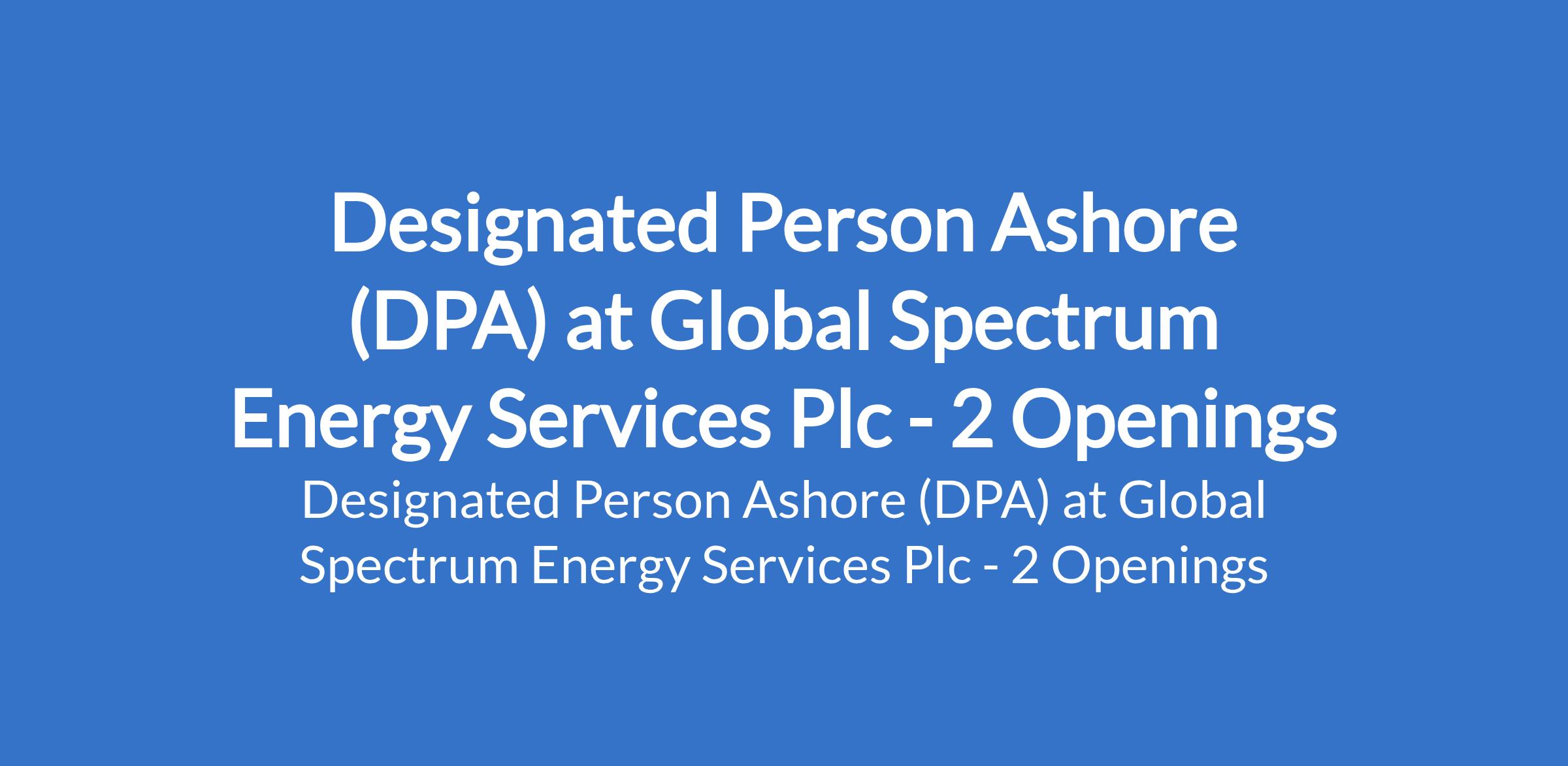 Global Spectrum Energy Services Plc is recruiting to fill the position of: Designated Person Ashore (DPA). The position is located in Abuja (FCT) and Port Harcourt - Rivers State. In this role, you will serve as the primary link between the companys shore-based management and its vessels, ensuring effective implementation of the Safety Management System (SMS) and compliance with applicable maritime safety and environmental protection regulations. Interested candidates should possess a Bachelors Degree in Marine Engineering, Nautical Science, Maritime Studies, or related discipline with 710 years relevant maritime experience, including vessel operations or marine safety management.