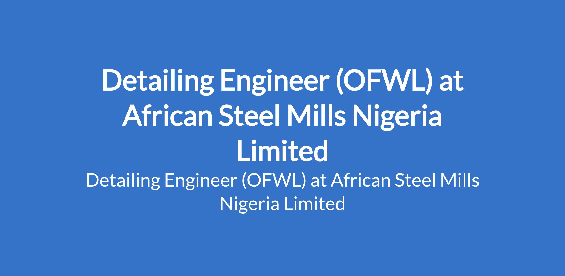 African Steel Mills Nigeria Limited is recruiting to fill the position of: Detailing Engineer (OFWL). The position is located in Lagos State. Interested candidates should possess a Bachelors Degree or HND in Mechanical Engineering, Structural Engineering, or related discipline with a minimum of 2 years experience in detailing, preferably in offshore, fabrication, or structural steel projects.