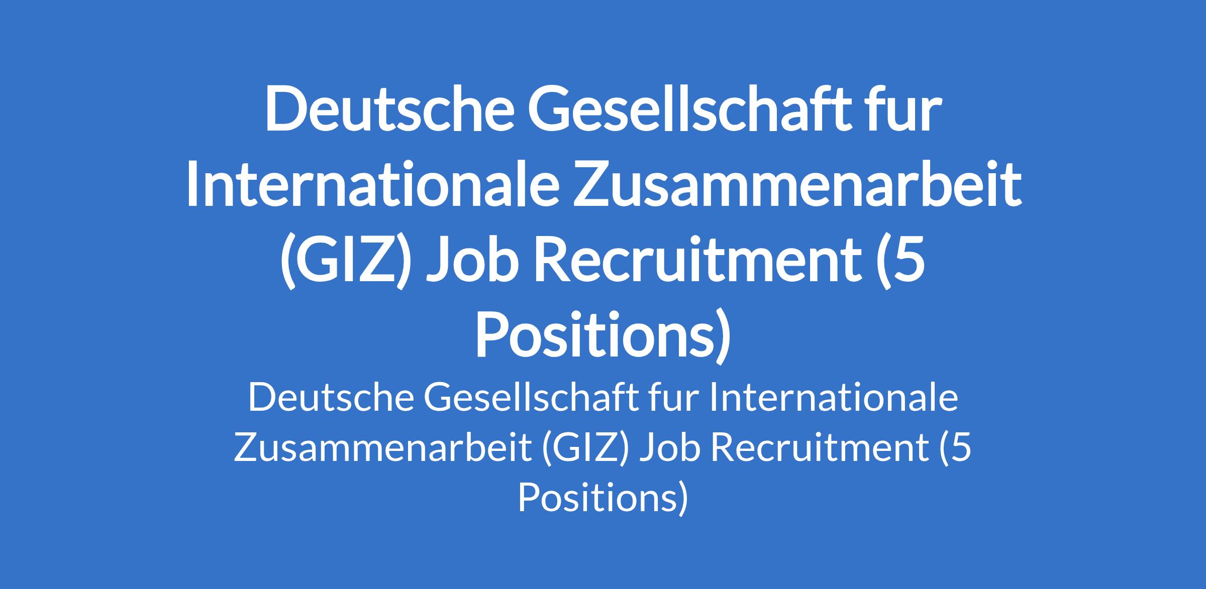 Deutsche Gesellschaft fur Internationale Zusammenarbeit (GIZ) is recruiting suitable candidates to fill the following positions in Abuja and Borno State: Infrastructure Advisor Driver, Head of Energy Information System, IT Advisor, and Regional Energy Policy Advisor.