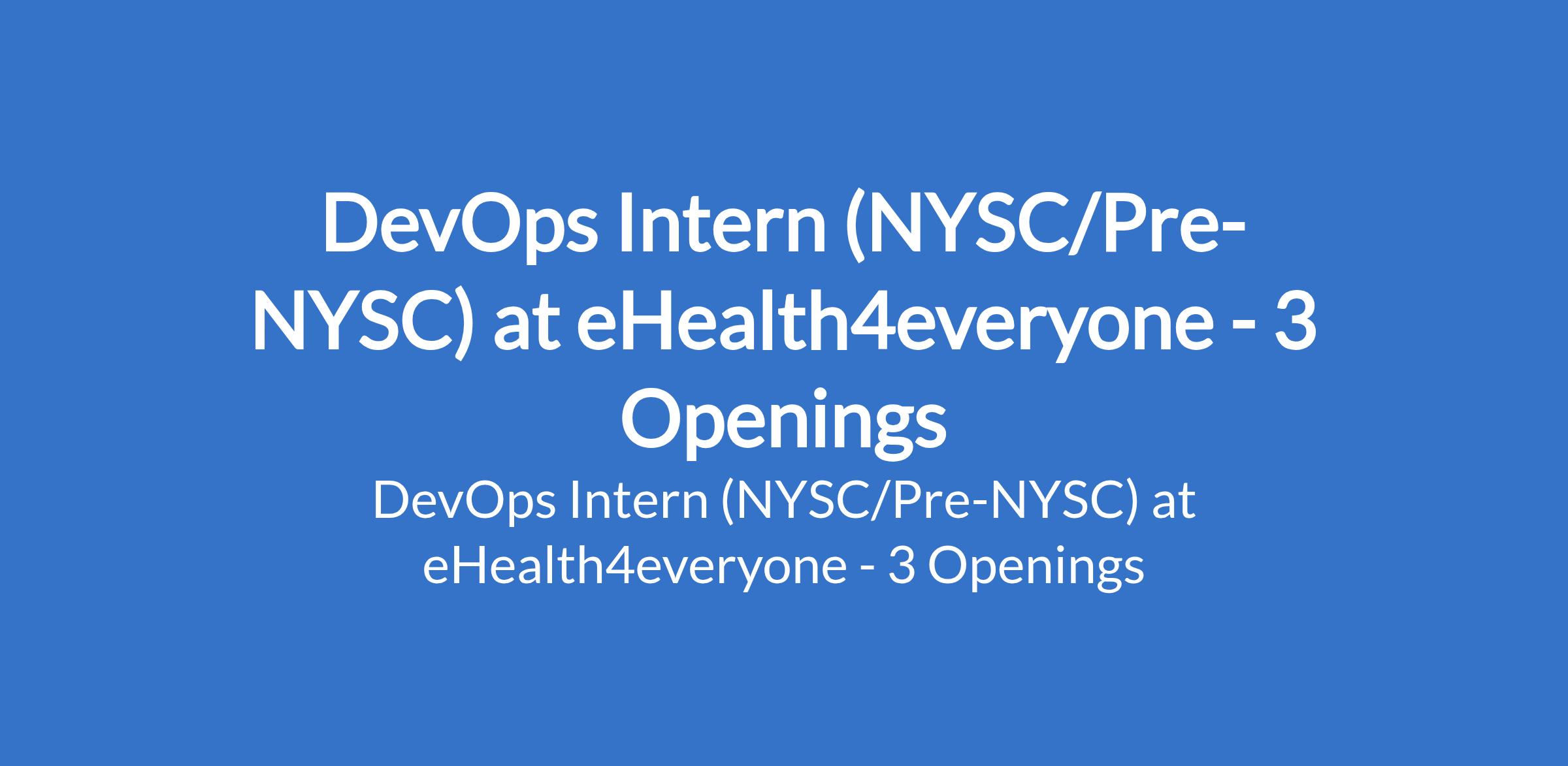 eHealth4everyone is recruiting to fill the position of: DevOps Intern (NYSC/PRE-NYSC). The position is located in Abia, Lagos, & Oyo States. Interested candidates should possess a Bachelor's Degree in Computer Science / Computer Engineering or other related areas with six months of Technical experience working with cloud technologies.