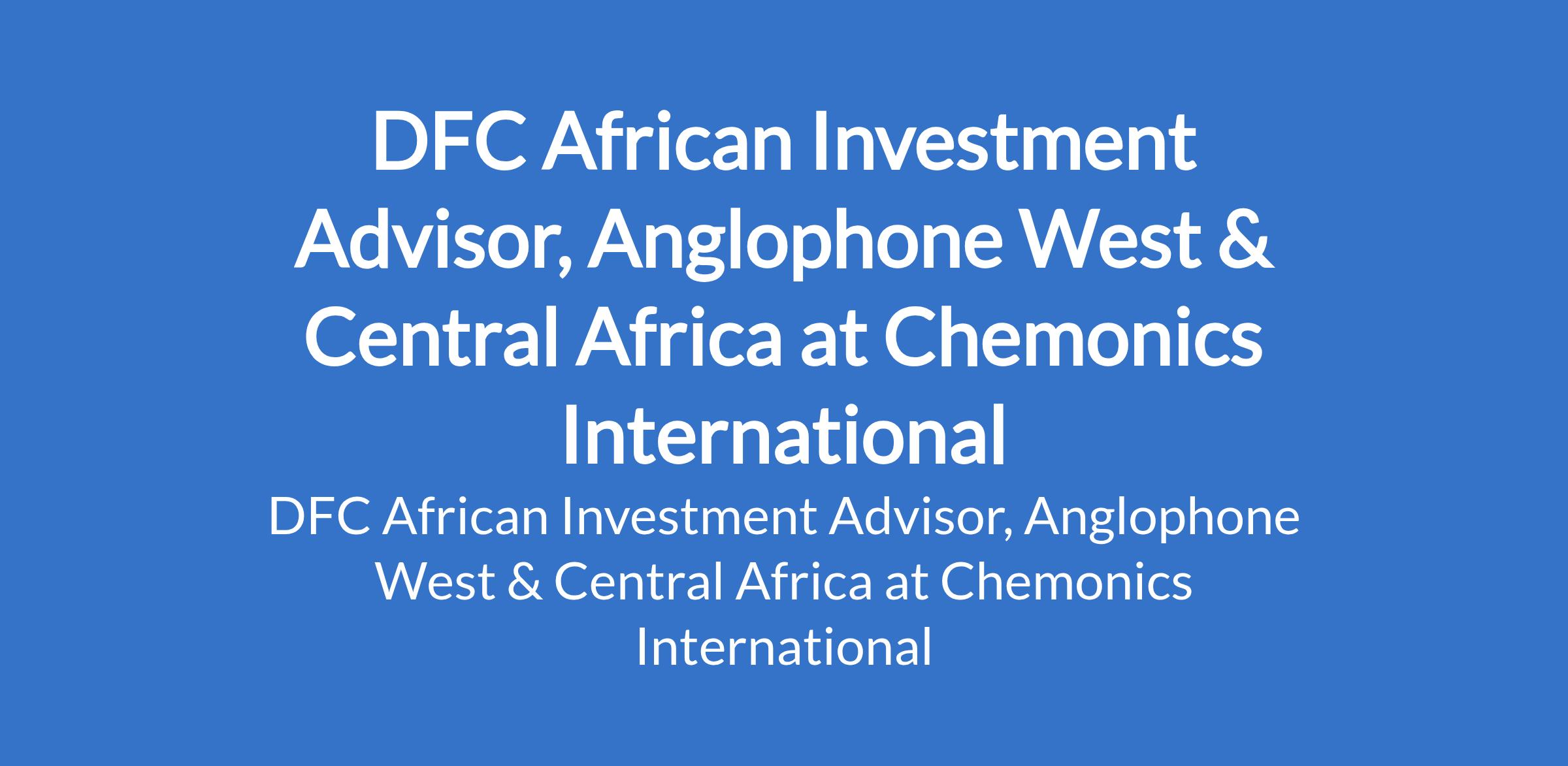 Chemonics International is recruiting to fill the position of: DFC African Investment Advisor, Anglophone West & Central Africa. Interested candidates should possess a Bachelor's Degree from an accredited university in a relevant field (advanced degree preferred) with a minimum of 15 years of total professional experience in a relevant field.