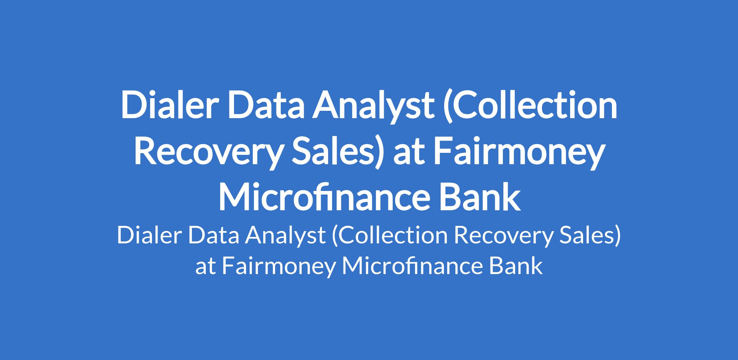 Fairmoney Microfinance Bank is recruiting to fill the position of: Dialer Data Analyst (Collection Recovery Sales). The position is located in Ikeja, Lagos State. Interested candidates should possess a relevant qualification with 8+ years of relevant experience in data analytics, preferably in collections, recovery, or contact center environments.