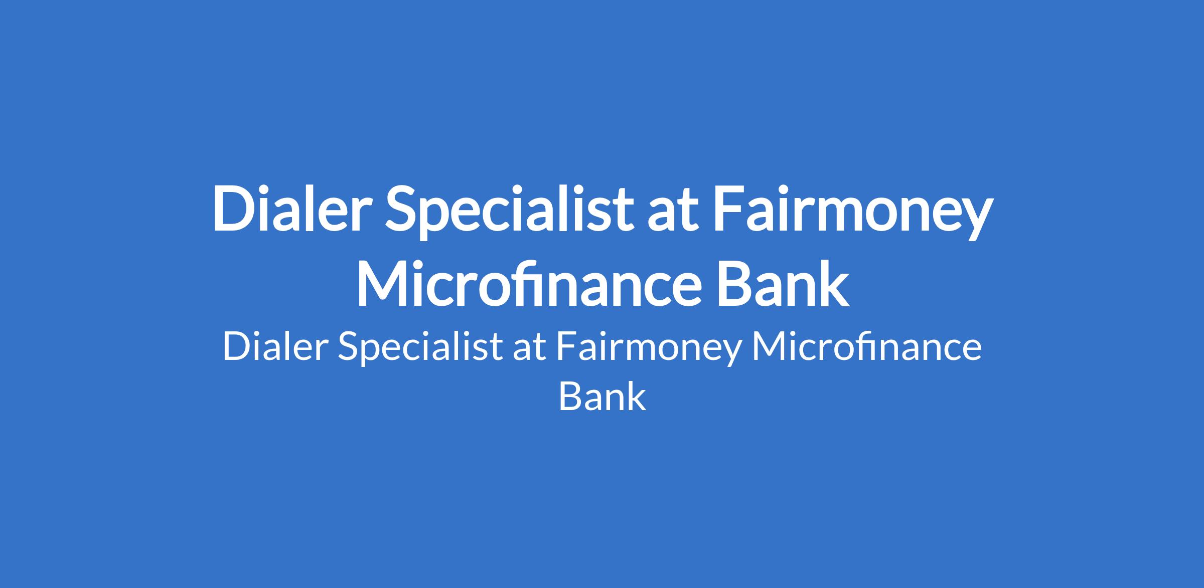 Fairmoney Microfinance Bank is recruiting to fill the position of: Dialer Specialist. The position is located in Ikeja, Lagos State. Interested candidates should possess relevant qualifications with 8+ years of relevant experience in data analytics, preferably in collections, recovery, or contact center environments.