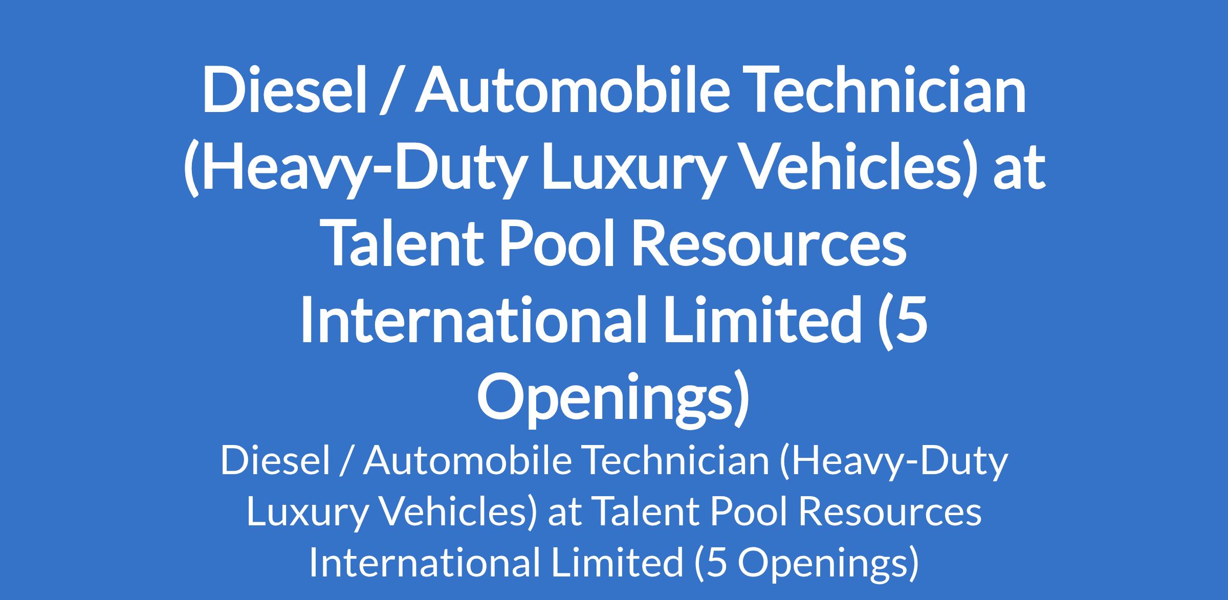 Talent Pool Resources International Limited is recruiting to fill the position of: Diesel / Automobile Technician (Heavy-Duty Luxury Vehicles). The position is located in Lagos Mainland, Lagos State. Interested candidates should possess a Diploma or certification in Automotive Technology or Diesel Mechanics with 5 - 8 years relevant industry experience.