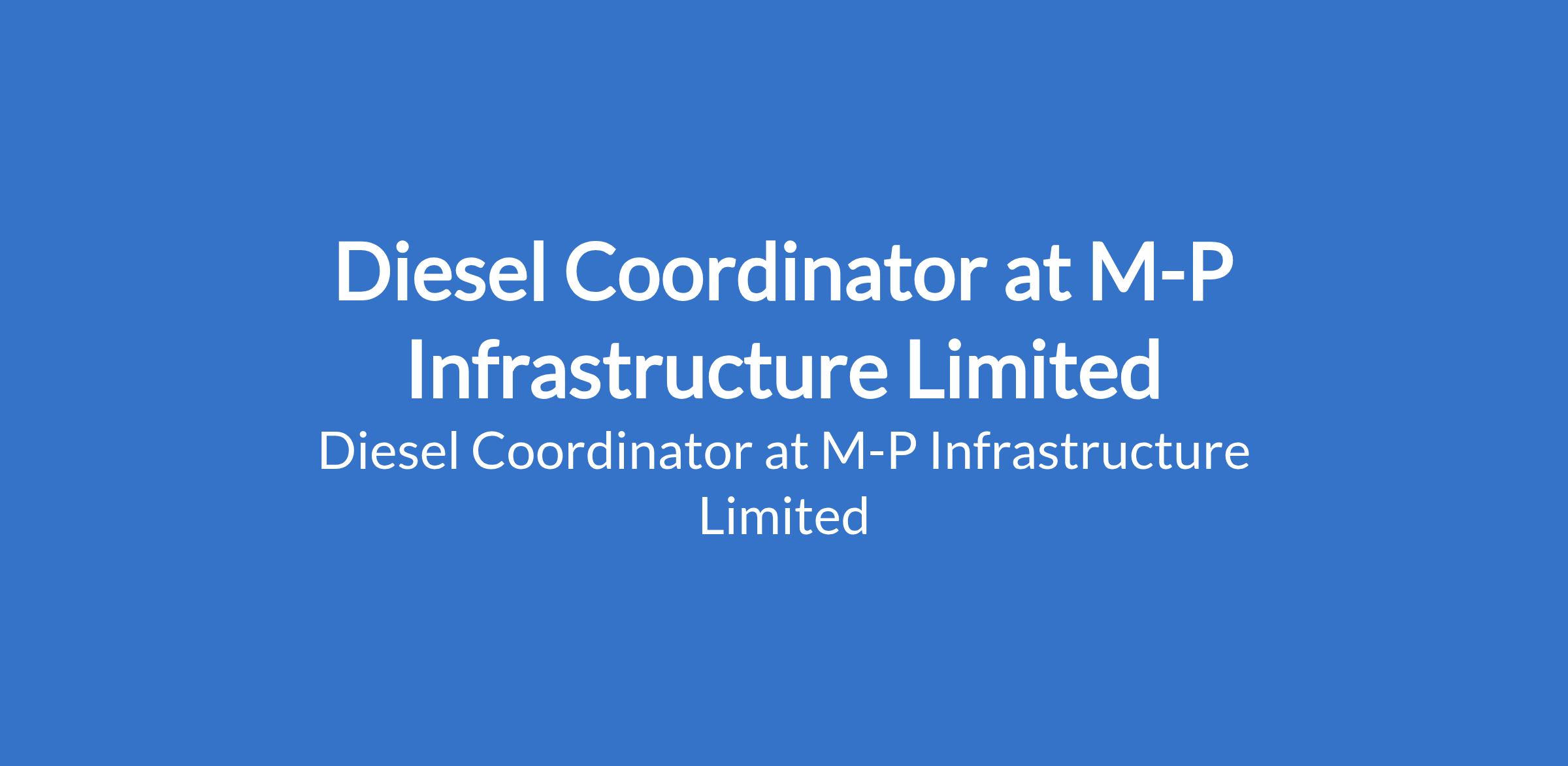 M-P Infrastructure Limited is recruiting to fill the position of: Diesel Coordinator. Interested candidates should possess a Bachelors Degree in Engineering, Logistics, Supply Chain, or related field with a 2 5 years relevant operational or fuel coordination experience.