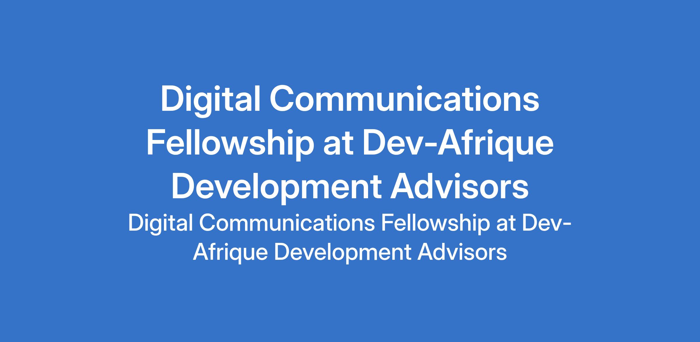 Dev-Afrique Development Advisors is recruiting to fill the position of: Digital Communications Fellowship. Interested candidates should possess a Bachelors Degree in Communications, Digital Media, or related field with a minimum of three years of experience in digital communications or social media management.