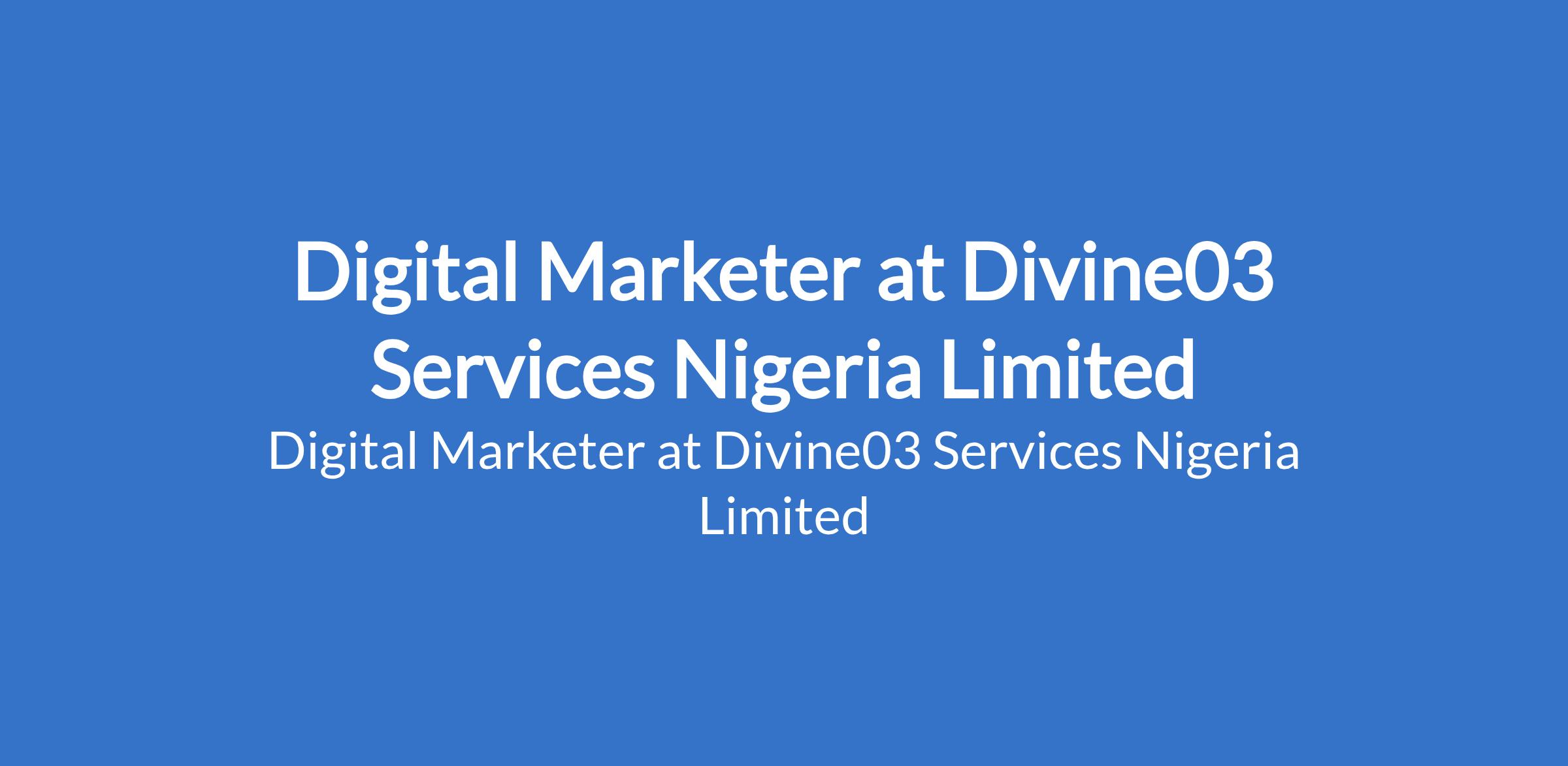 Divine03 Services Nigeria Limited is recruiting to fill the position of: Digital Marketer. The position is located in Lagos State. Salary: N120,000 - N180,000 / month. The ideal candidate will be responsible for increasing brand awareness, generating leads, and driving customer engagement across digital platforms.