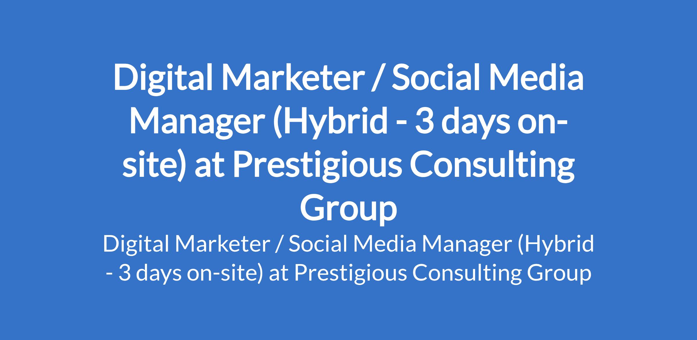 Prestigious Consulting Group is recruiting to fill the position of: Digital Marketer / Social Media Manager (Hybrid - 3 days on-site). The position is located in Ikoyi, Lagos State. Salary: N150,000 / month. The ideal candidate will be responsible for growing brand awareness, driving traffic, generating leads, and supporting overall business goals through digital channels. Interested candidates should possess relevant qualifications with proven experience in digital marketing or social media management.