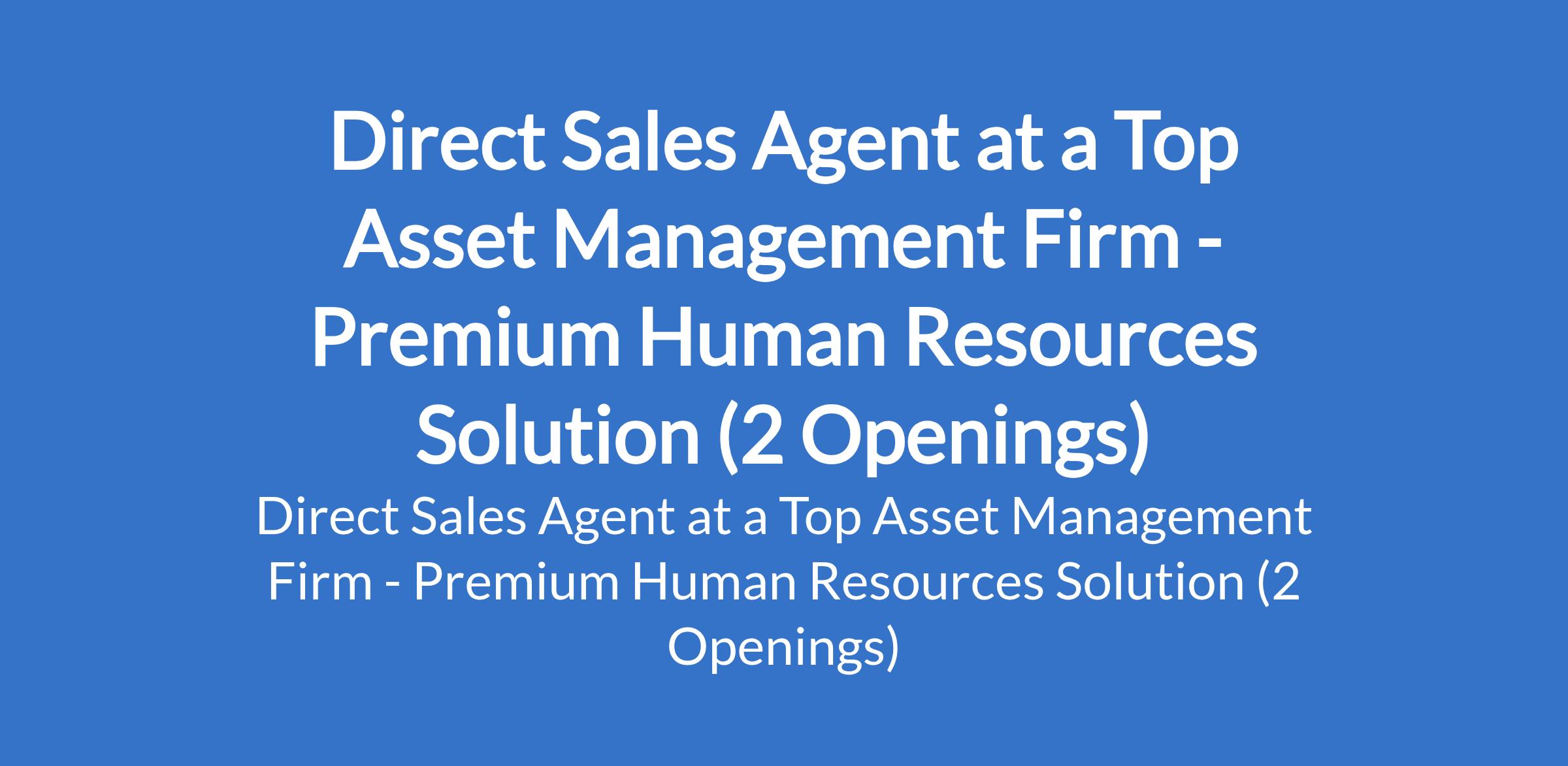 Premium Human Resources Solution - Our client, a top Asset management Firm is recruiting to fill the position of: Direct Sales Agent. The position is located in Lagos and Oyo States. Salary: N75,000 per month. Interested candidates should possess an OND / HND / B.Sc Degree with a minimum of 1 year (Sales Experience).