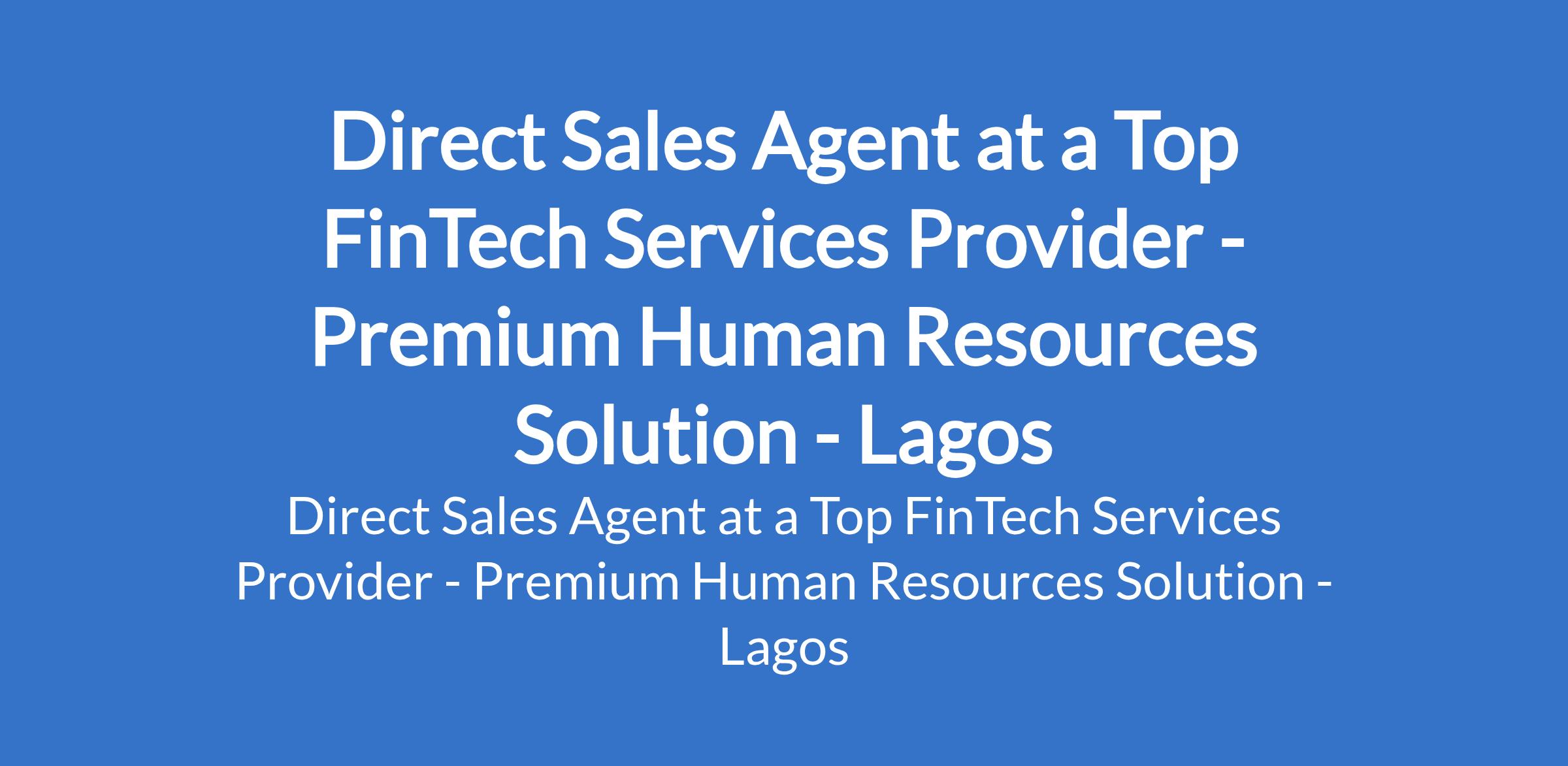 Premium Human Resources Solution - Our client, a top FinTech services provider is recruiting to fill the position of: Direct Sales Agent. The position is located in Lagos State. Salary: N200,000 per month. Interested candidates should possess a Higher National Diploma (Upper Credit Only) and Bachelors Degree in Business Administration, Sales, Marketing, Economics, Information Technology,or any relevant field with 13 years of relevant sales or field marketing experience, preferably in fintech, financial services, or telecommunications.
