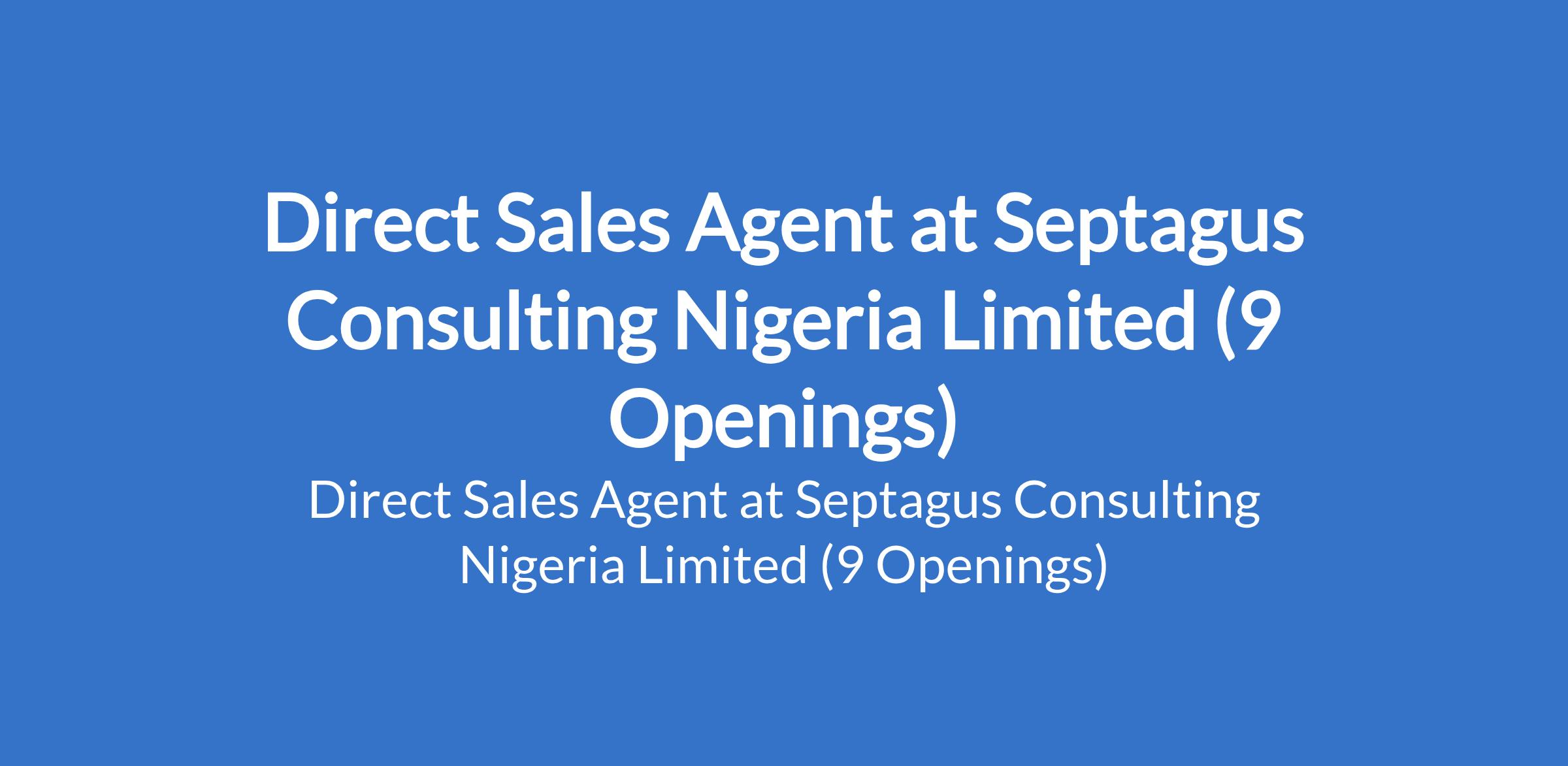 Septagus Consulting Nigeria Limited is recruiting to fill the position of: Direct Sales Agent. The position is located in Aba - Abia, Uyo - Akwa Ibom, Awka - Anambra, Owerri - Imo, Port Harcourt - Rivers, Enugu, Warri - Delta, Abakaliki - Ebonyi, and Calabar - Cross River States. Salary: N107,000 - N110,000 per month. Interested candidates should possess relevant qualifications with experience.