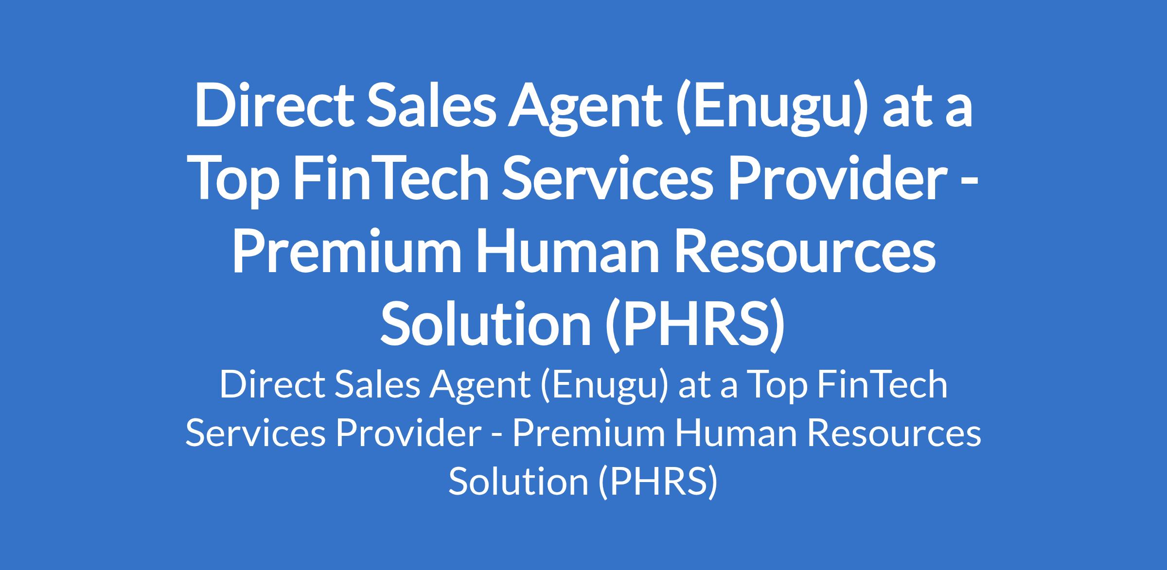 Premium Human Resources Solution (PHRS) - Our client, a top FinTech Services Provider is recruiting to fill the position of: Direct Sales Agent. The position is located in Enugu State. Salary: N200,000 / month. Interested candidates should possess a Bachelors Degree in Business, Sales, Marketing, Economics, technology, or any relevant field with 1 - 3 years of relevant sales or field marketing experience, preferably in fintech, financial services, or telecommunications.