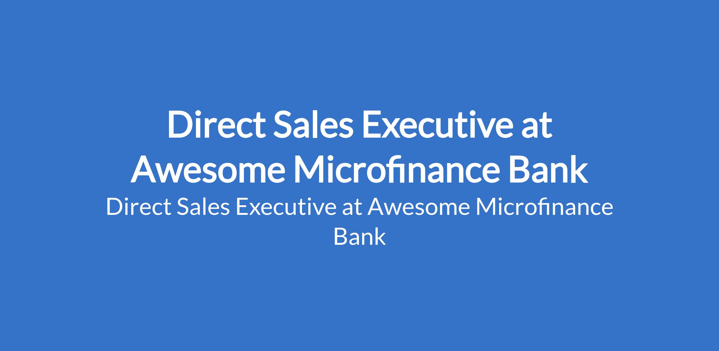 Awesome Microfinance Bank is recruiting to fill the position of: Direct Sales Executive. The position is located in Abuja. Interested candidates should possess a Bachelor's Degree or equivalent.