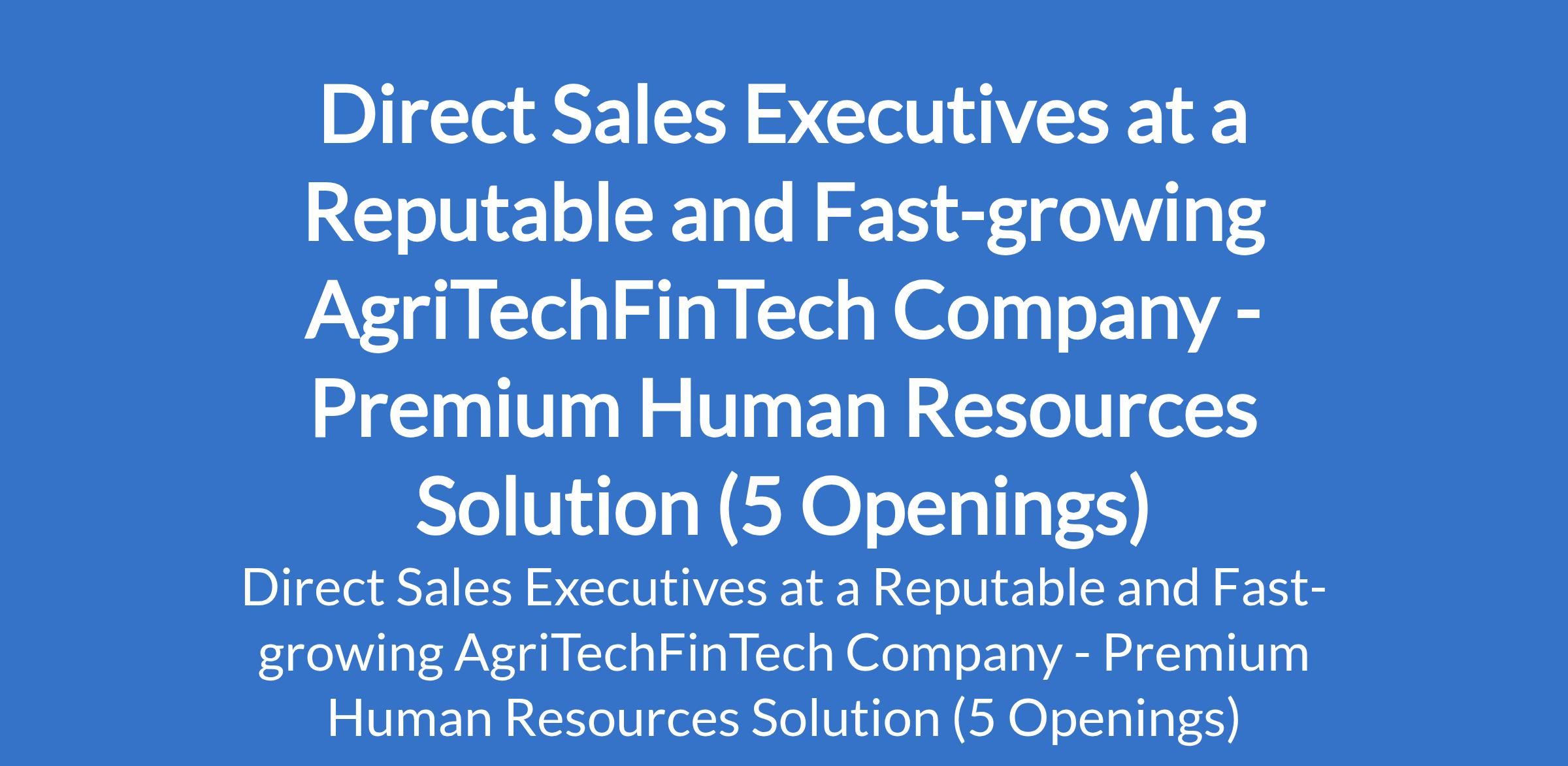 Premium Human Resources Solution - Our client, a reputable and fast-growing AgriTechFinTech company in Nigeria is recruiting to fill the position of: Direct Sales Executive. The position is located in Abuja, Lagos, Karu - Nasarawa, Ekiti, and Akure - Ondo States. Salary: N100,000 - N104,000 monthly. Interested candidates should possess an NCE / OND / HND / B.Sc Degree with a minimum of 1 year of sales/marketing experience.