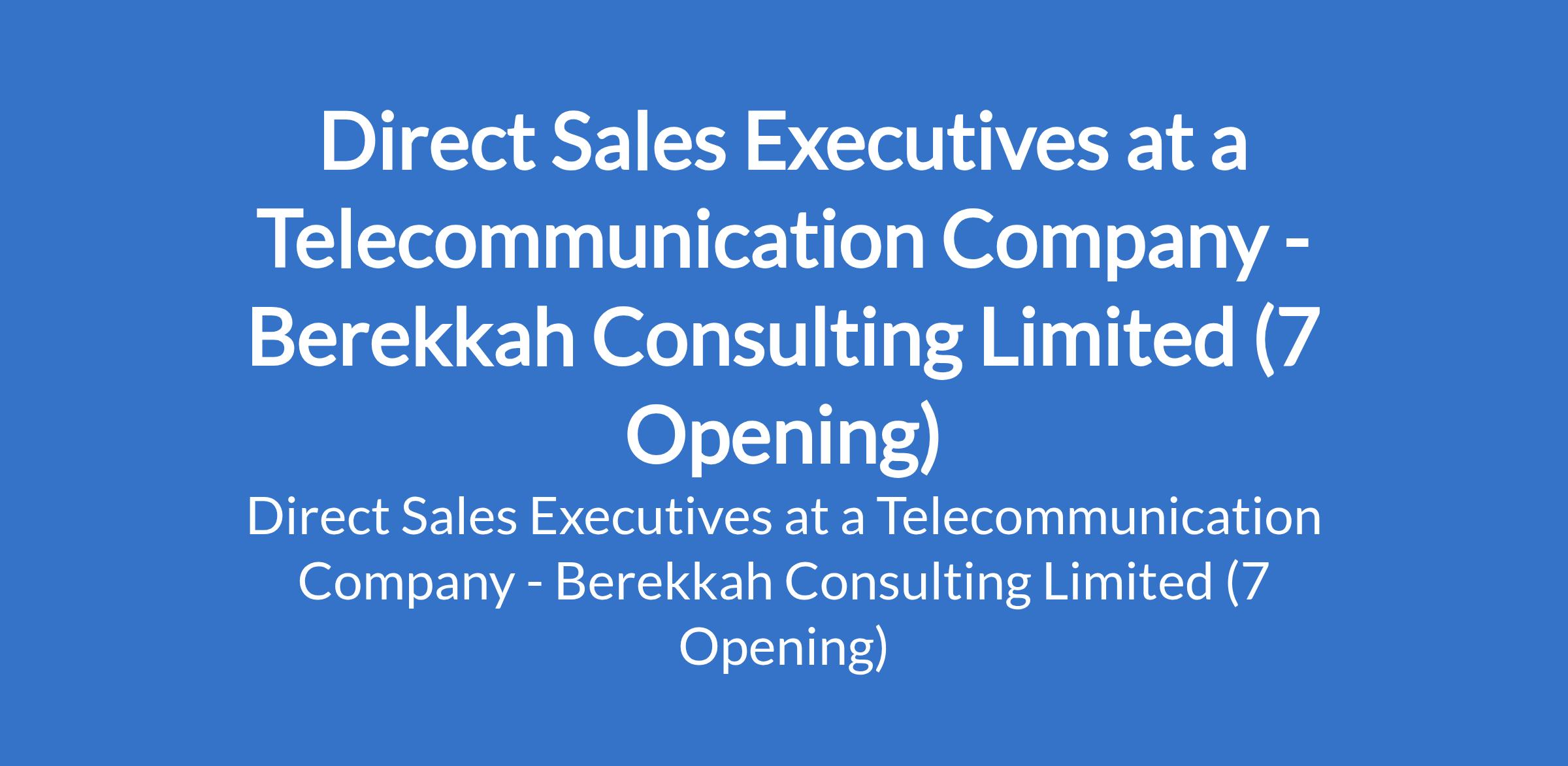 Berekkah Consulting Limited - Our client, a Telecommunication company is recruiting to fill the position of: Direct Sales Executives. The position is located in Ikeja, Ogba, Alimosho, Ikorodu, Agege, Kosofe, Ifako Ijaye - Lagos State. Salary: N150,000 - N300,000 monthly. Interested candidates should possess an OND, HND or Bachelors Degree in any relevant course with a minimum of 1 year experience in any field.