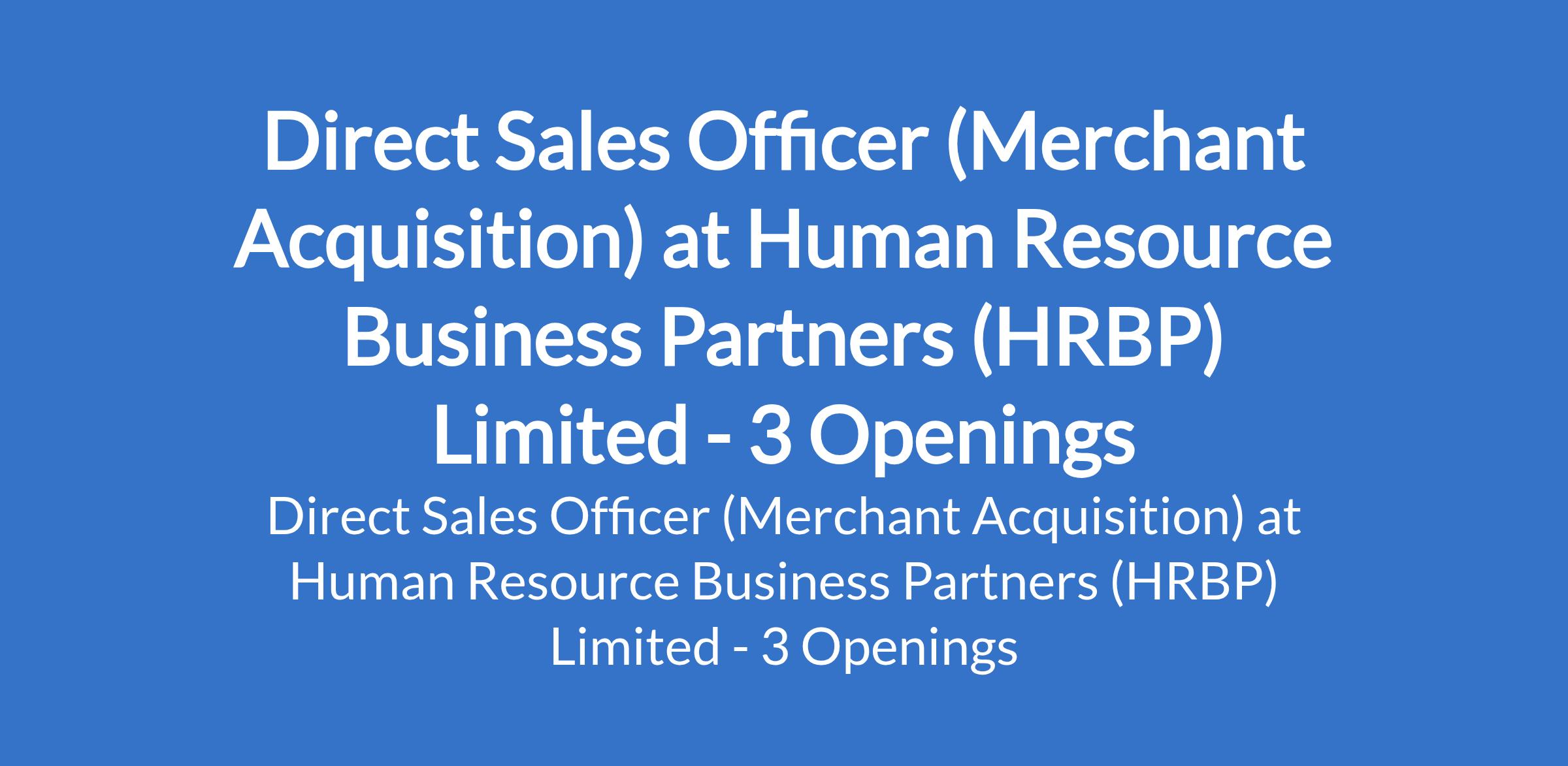 Human Resource Business Partners (HRBP) Limited is recruiting to fill the position of: Direct Sales Officer (Merchant Acquisition). The position is located in Victoria Island, Ikoyi & Lekki - Lagos State. Salary: N150,000 per month. Interested candidates should possess relevant qualifications with 12 years sales experience B2B sales (Very important).