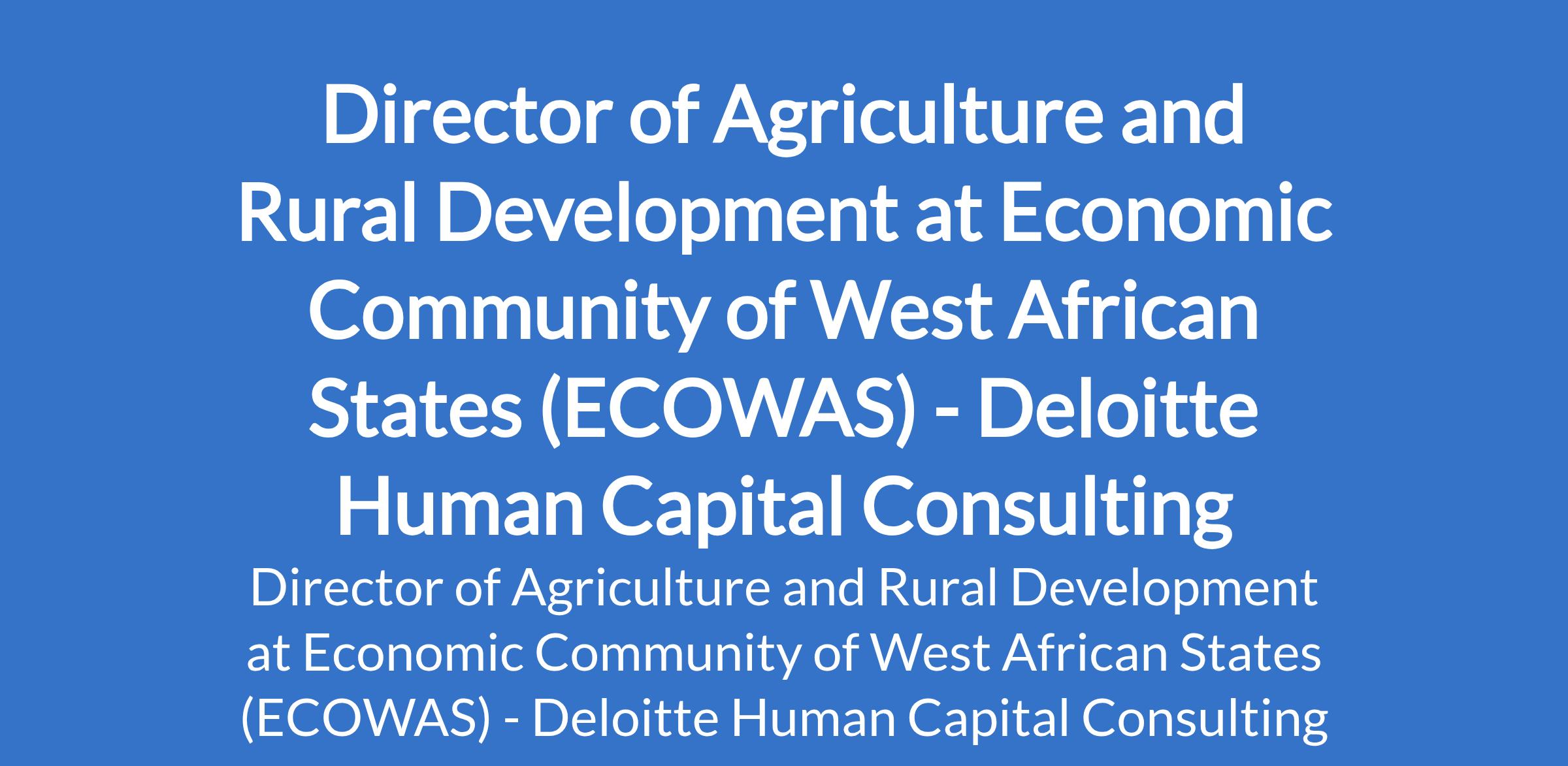 Deloitte Human Capital Consulting - Our client, Economic Community of West African States (ECOWAS) is recruiting to fill the position of: Director of Agriculture and Rural Development. The position is located in Abuja. Salary: UAC 81,435.54 / USD 128,488.99 annually. Interested candidates should possess a Masters Degree (or equivalent) in Agricultural Economics, Agronomy, Business Administration, Regional Planning and Development or a related field with 12 years of relevant experience in combining economic and quantitative analysis with policy engagement in agribusiness and value chain development and agricultural and rural development.