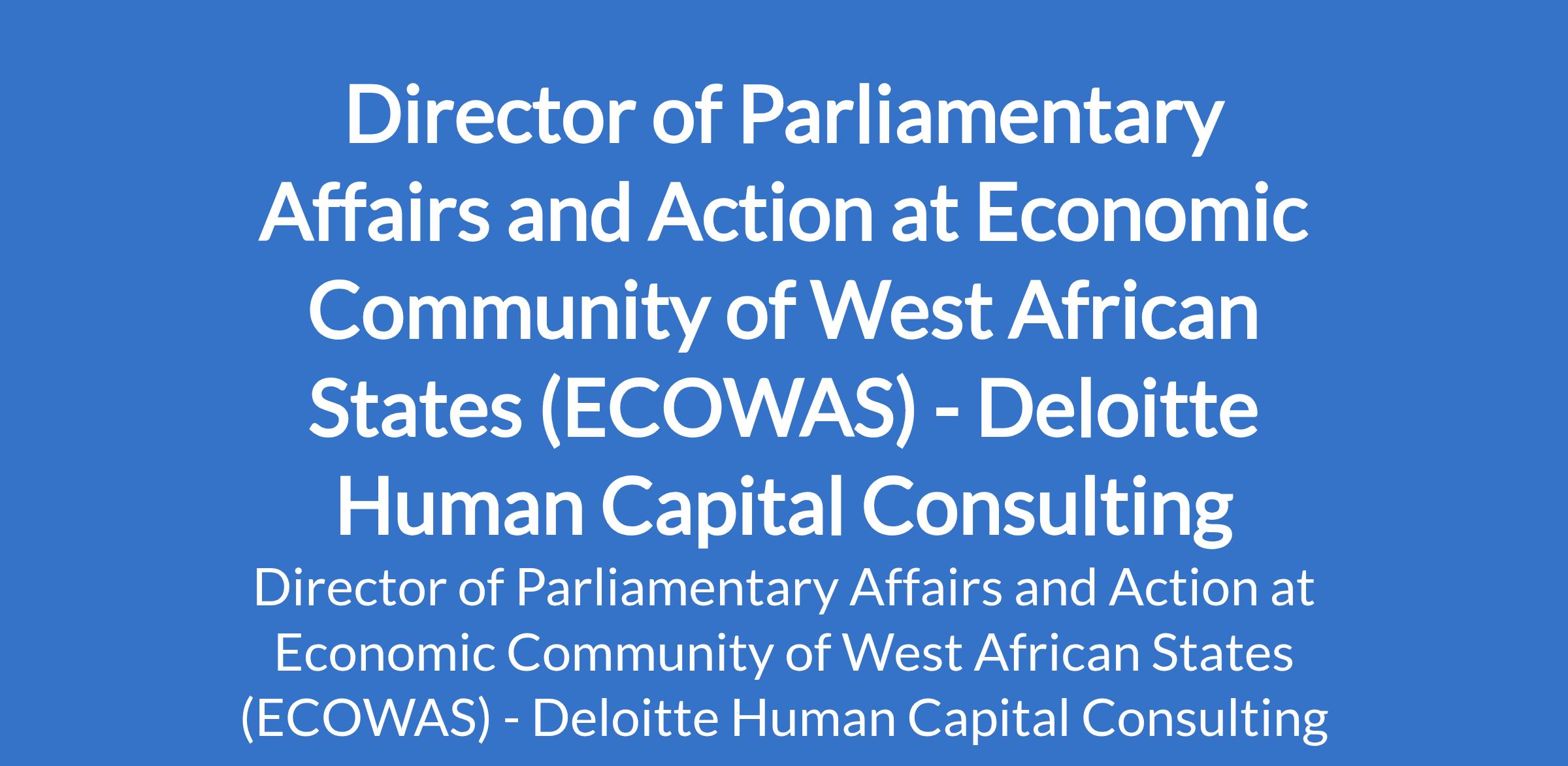 Deloitte Human Capital Consulting - Our client, Economic Community of West African States (ECOWAS) is recruiting to fill the position of: Director of Parliamentary Affairs and Action. The position is located in Abuja. Salary: UC81.435.54 / USD 128.488.99 annually. Interested candidates should possess a Master`s Degree in Law, Public Administration, Social Sciences or other related discipline, obtained in a recognized University, at a minimum; with twelve years of professional experience, including six years of relevant international experience and five years at the supervisory level.