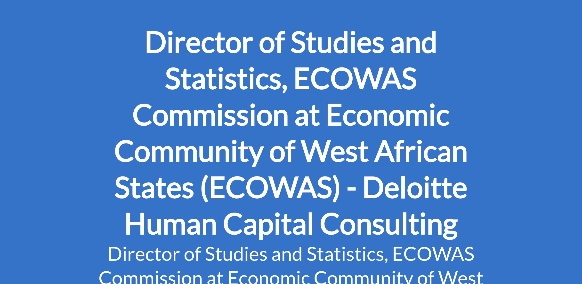 Deloitte Human Capital Consulting - Our client, Economic Community of West African States (ECOWAS) is recruiting to fill the position of: Director of Studies and Statistics, ECOWAS Commission. The position is located in Abuja. Salary: UC81.435.54 / USD 128.488.99 annually. Interested candidates should possess a Master`s Degree in Economics, Statistics, focusing on social, macroeconomic, and political aspects of development, obtained in a recognized university with 12 years of progressively responsible experience in the area of Studies and Policy and Statistical Programs, including 6 years of relevant international professional experience and 5 years in supervisory roles.