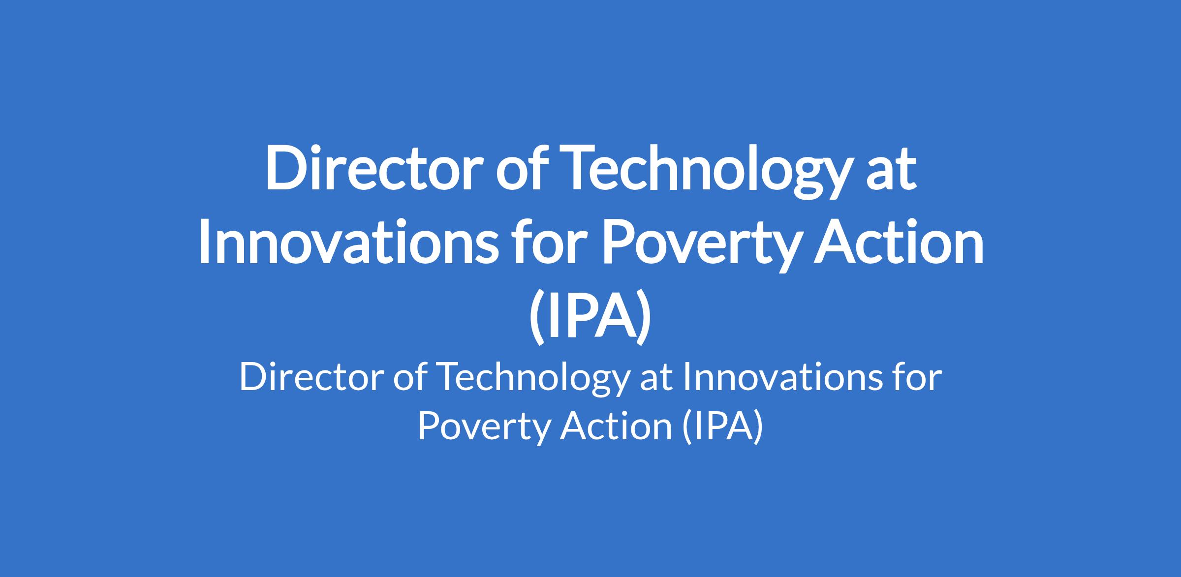 Innovations for Poverty Action (IPA) is recruiting to fill the position of: Director of Technology. Interested candidates should possess relevant qualifications with 7+ years experience in a senior IT leadership role with accountability for the reliability, security, and availability of enterprise systems in production environments.