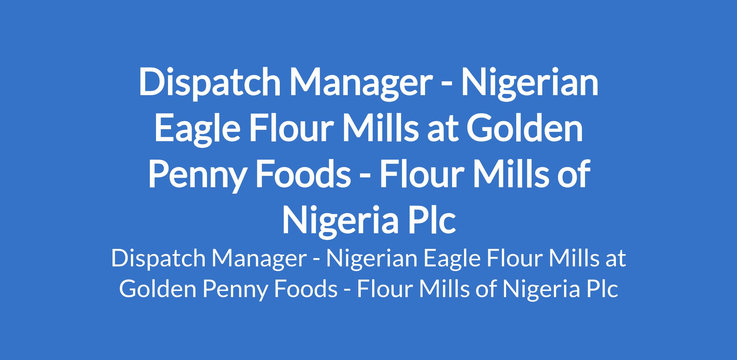 Golden Penny Foods, a subsidiary of Flour Mills of Nigeria Plc is recruiting to fill the position of: Dispatch Manager - Nigerian Eagle Flour Mills. Interested candidates should possess aN HND / Bachelors Degree in Logistics, Supply Chain Management, Business Administration, or a related field with a minimum of 5 years experience in dispatch, logistics, or transport management.