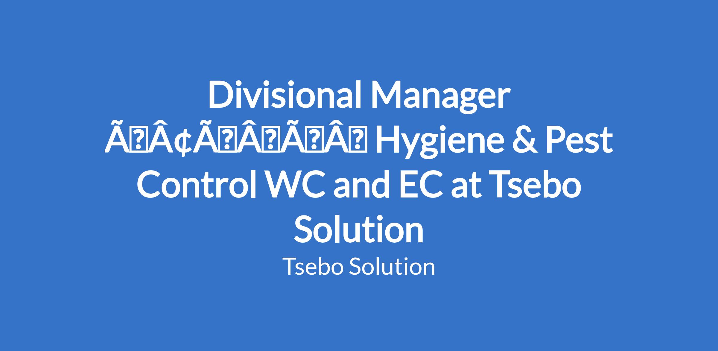 Divisional Manager âÃÂàHygiene & Pest Control WC and EC at Tsebo Solution