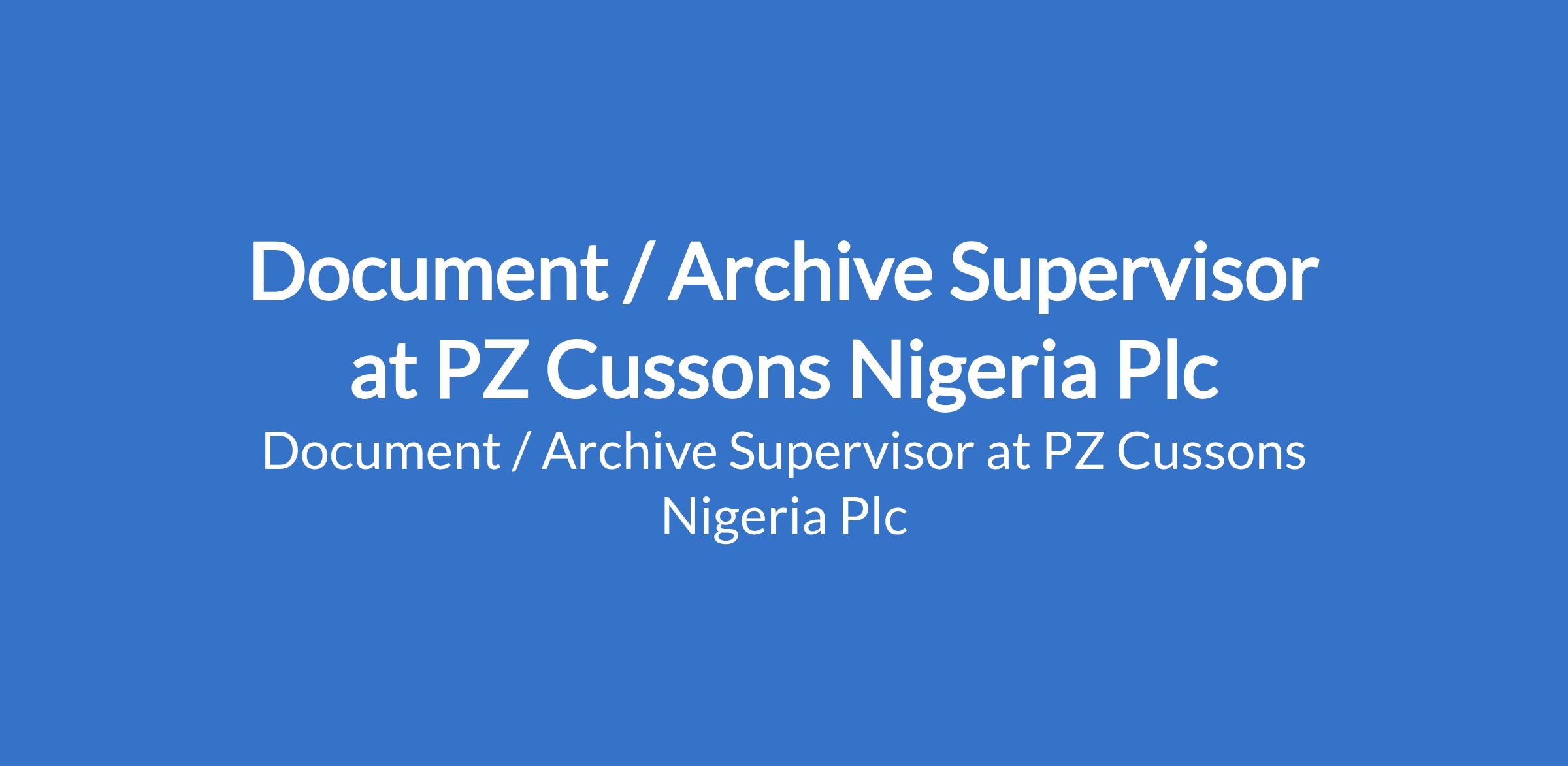 PZ Cussons Nigeria Plc is recruiting to fill the position of: Document / Archive Supervisor. The position is located in Ilupeju, Lagos State. Interested candidates should possess an N.D qualification in Accounting, Finance or Business Administration with 1 3 years work experience.