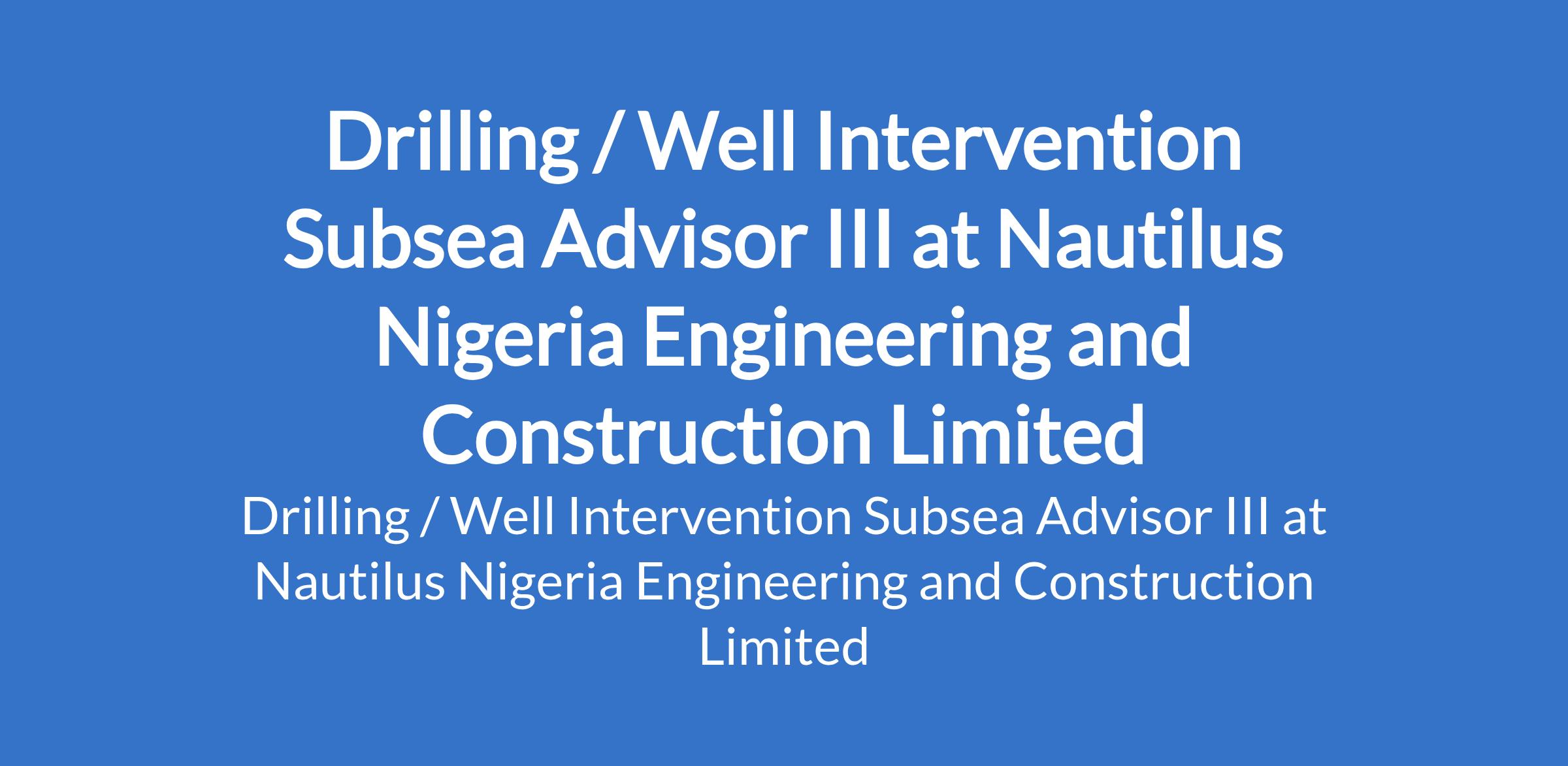 Nautilus Nigeria Engineering and Construction Limited (NNEC) is recruiting to fill the position of: Drilling / Well Intervention Subsea Advisor III. The position is located in Akwa Ibom State. Interested candidates should possess relevant qualifications with previous experience in a closely related position.