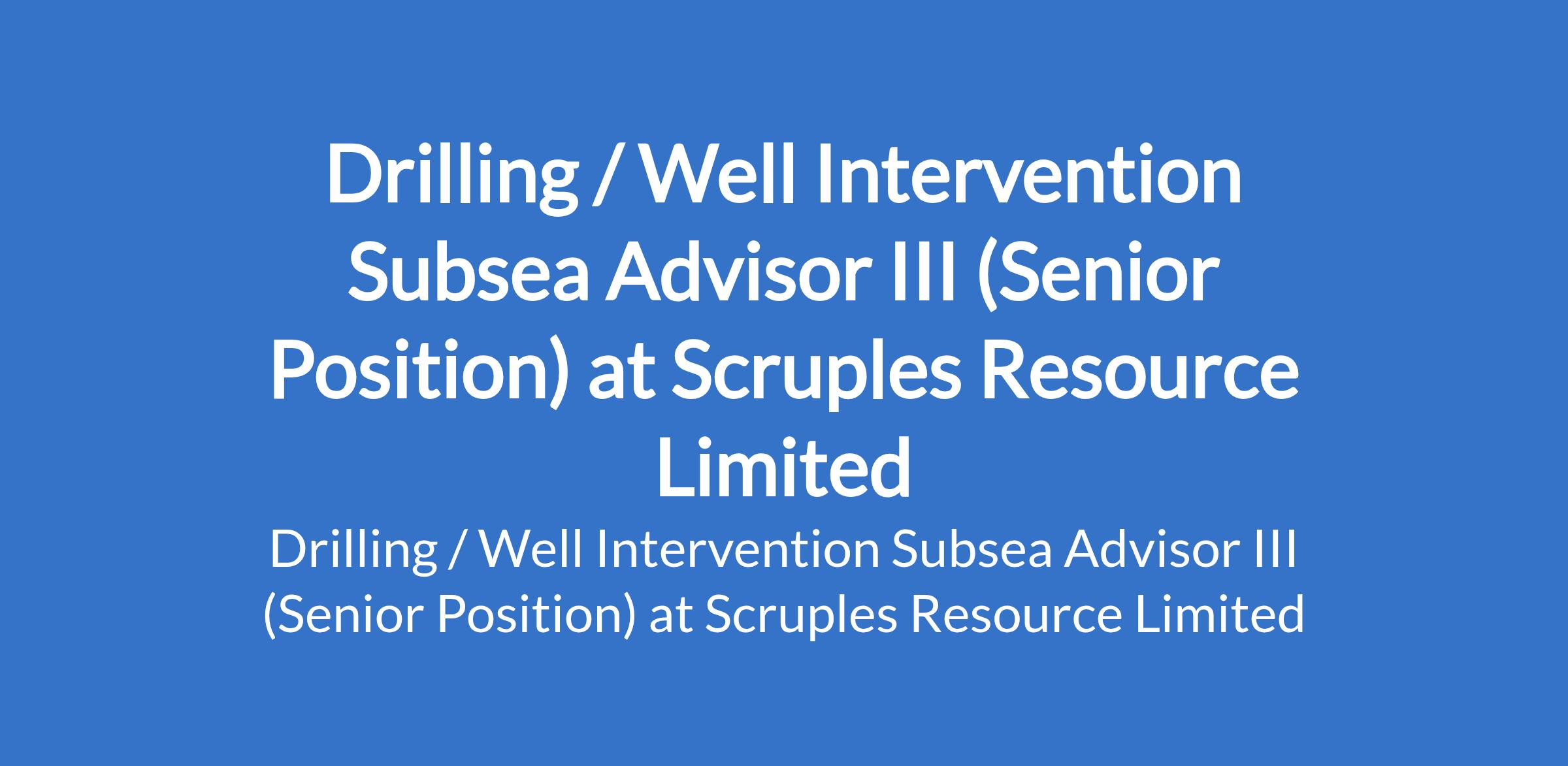 Scruples Resource Limited is recruiting to fill the position of: Drilling / Well Intervention Subsea Advisor III . The position is located in offshore, Lagos State. Interested candidates should possess relevant qualifications with at least 3 years of experience in the oil and gas industry.