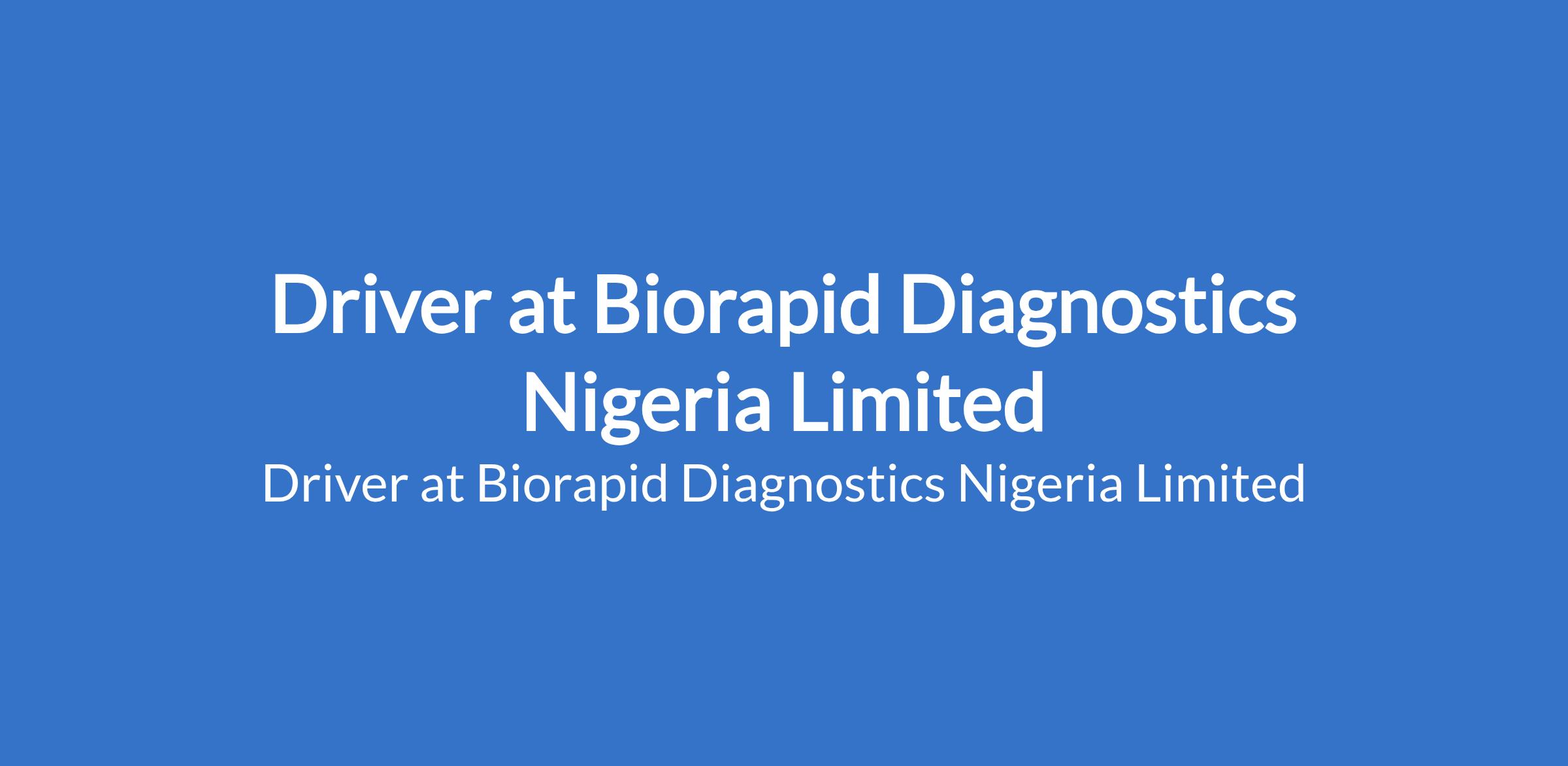 Biorapid Diagnostics Nigeria Limited is recruiting to fill the position of: Driver. The position is located in Abuja (FCT). Interested candidates should possess minimum of an SSCE qualification and a Valid Nigerian drivers license, with proven driving experience (commercial or company driving preferred), and should leave within Nyanya, Jikwoyi, Karu, Kurudu, Karshi, or Mararaba.