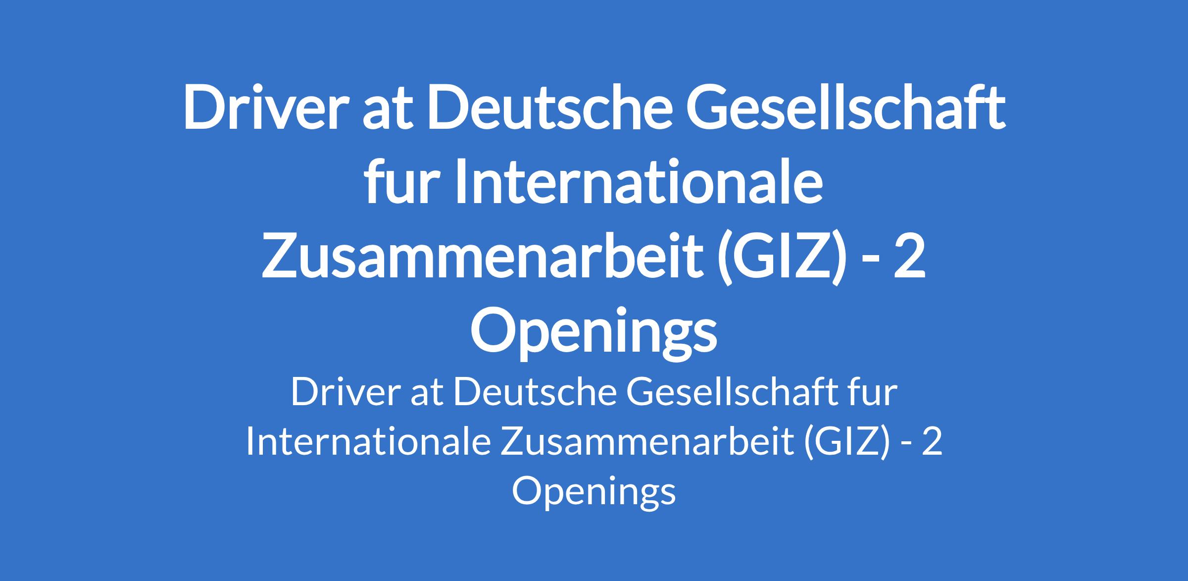 Deutsche Gesellschaft fur Internationale Zusammenarbeit (GIZ) is recruiting to fill the position of: Driver. The position is located in Yola - Adamawa and Maiduguri - Borno States. Interested candidates should possess a minimum of Secondary School Education; must be good in MS word / MS excel / Outlook for emails; holds a valid drivers license with 3 years work experience as a driver with international organization with a safe driving record.