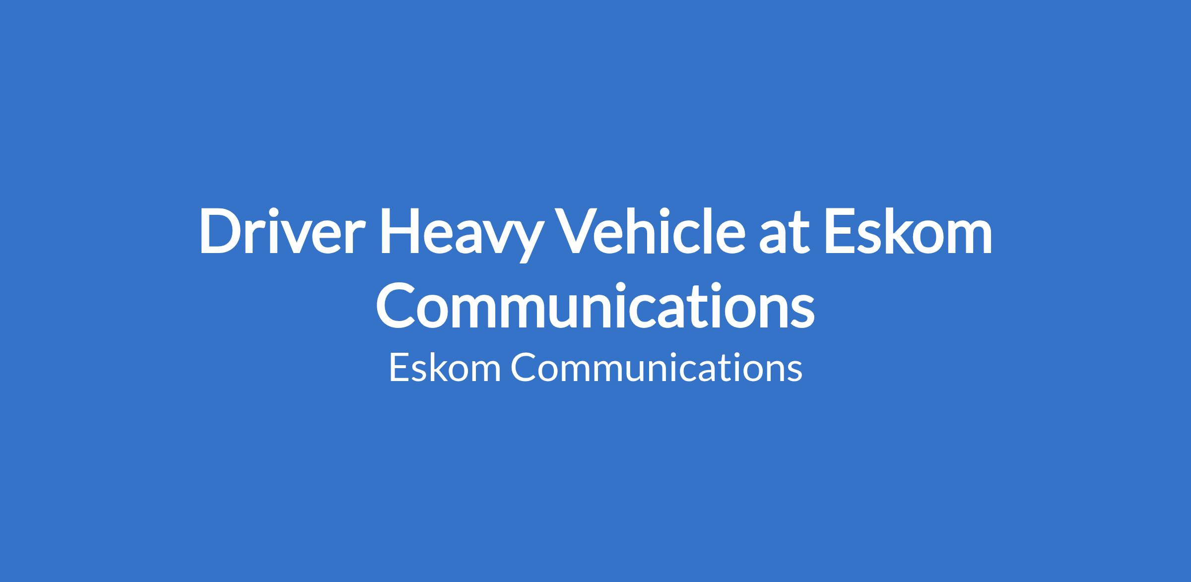 Area of specialization: To drive and operate specialised equipment for the plant cleaning purposes to provide heavy duty delivery services: Department: Operating Support: Position: Driver Heavy Vehicle: Business Unit: Duvha Power Station: Location: Mpumalanga