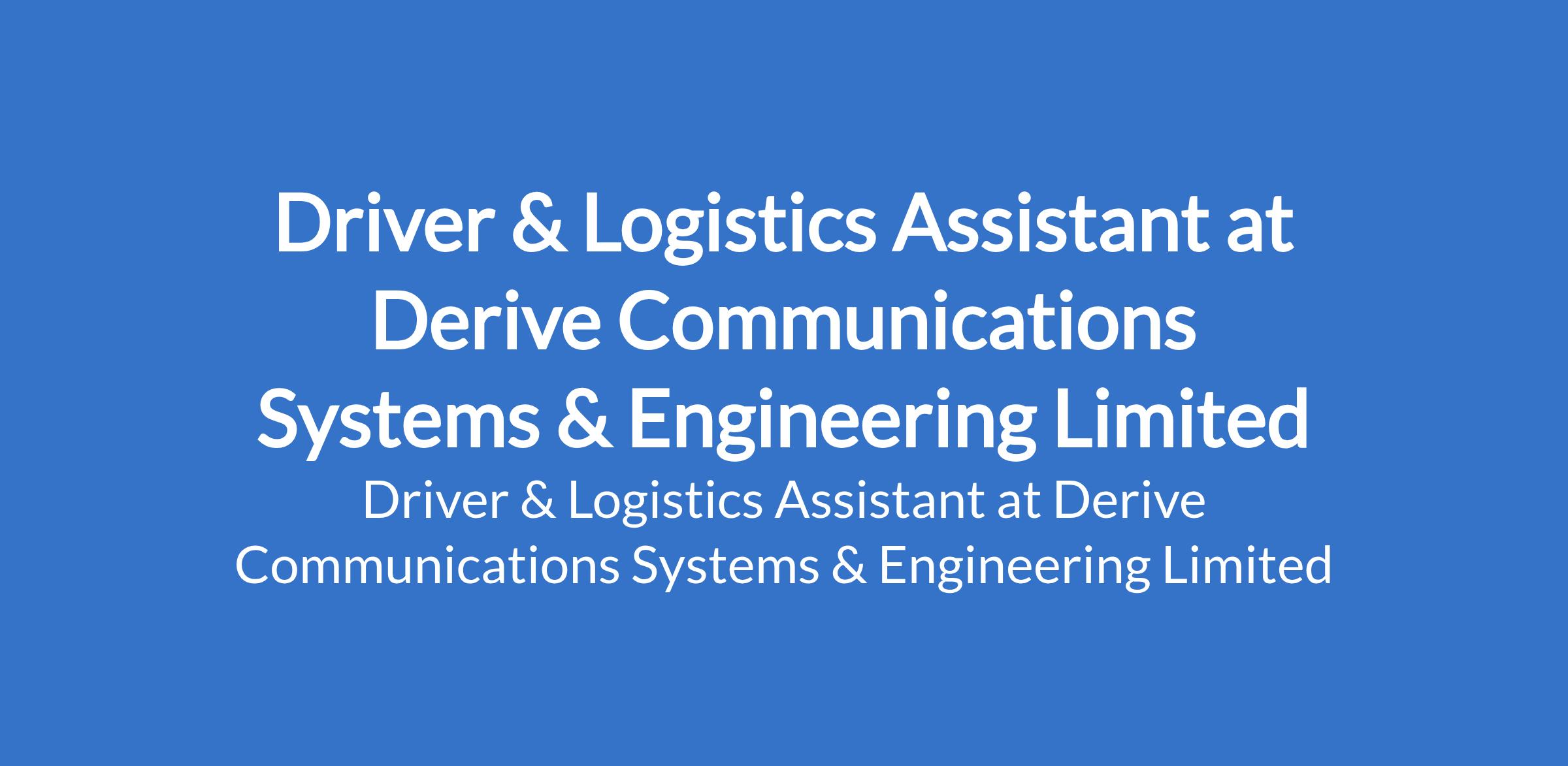 Derive Communications Systems & Engineering Limited is recruiting to fill the position of: Driver & Logistics Assistant. The position is located in Lugbe, Abuja (FCT). Interested candidates should possess relevant qualifications, a Valid drivers license with a minimum of 3 years driving experience.