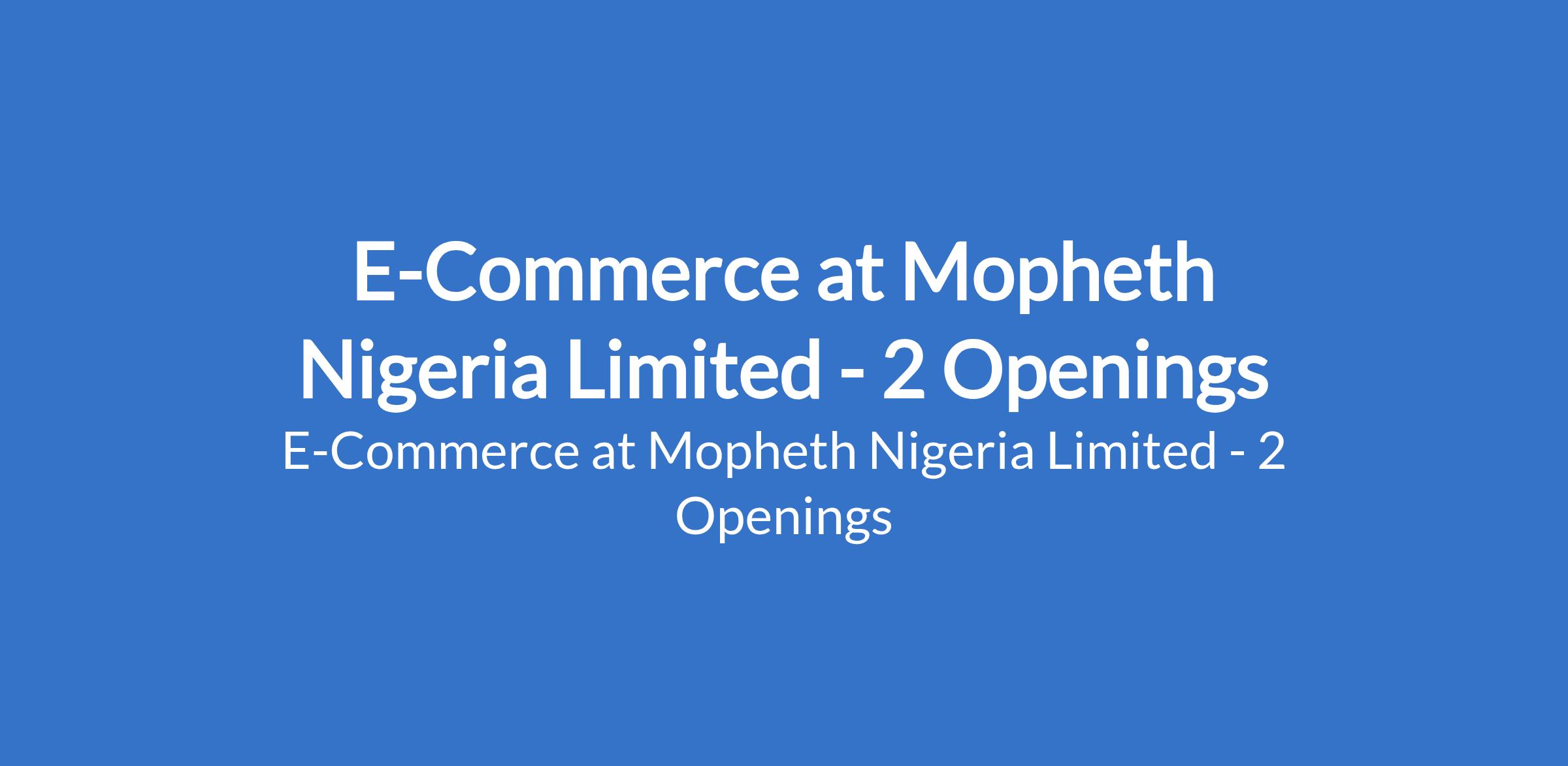 Mopheth Nigeria Limited is recruiting to fill the position of: Job Title: E-Commerce. The position is located in Victoria Island & Lekki, Lagos State. Salary: N350,000 N400,000 per month. Interested candidates should possess a Bachelors Degree in Marketing, Business, IT, or related field.