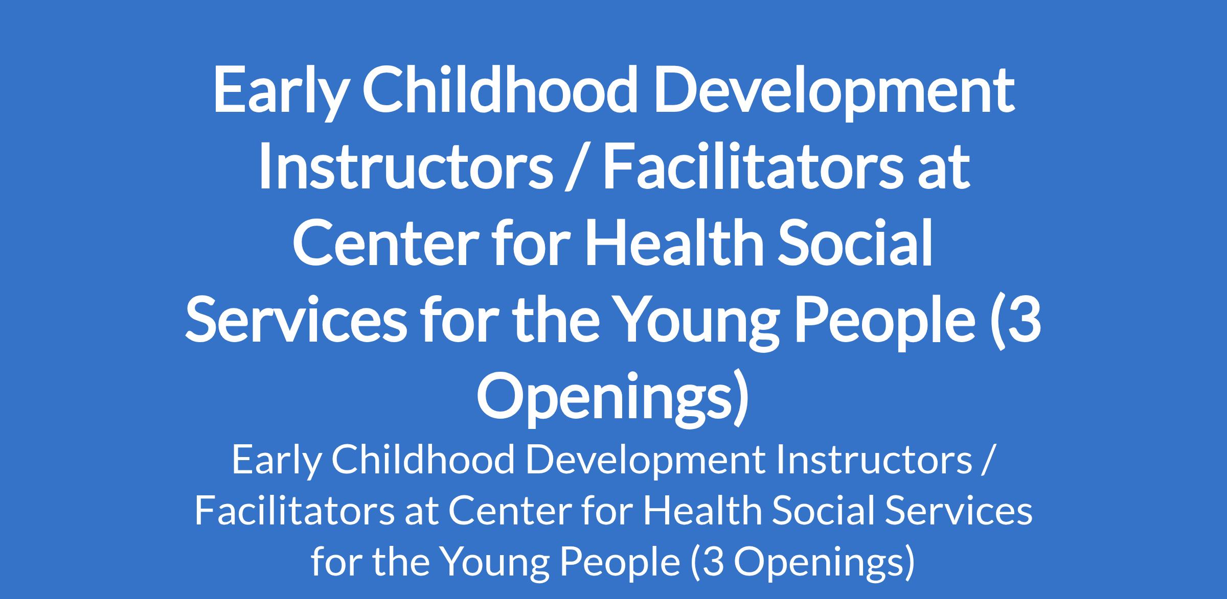 Center for Health Social Services for the Young People is recruiting to fill the position of: Early Childhood Development Instructor / Facilitator. The position is located in Abuja. Interested candidates should possess a Bachelors Degree, NCE, or Higher National Diploma in Early Childhood Education, Child Development, Education, Home Economics, Social Work, or related fields with a minimum of 5 years of experience in teaching or training in Early Childhood Education or childcare.