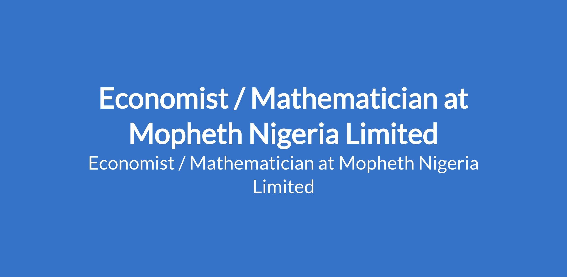 Mopheth Nigeria Limited is recruiting to fill the position of: Economist / Mathematician. The position is located in Victoria Island (VI), Iyana-Oworo, or Lekki Phase - Lagos State. Interested candidates should possess an OND/HND qualification in Economics, Mathematics, or related fields.