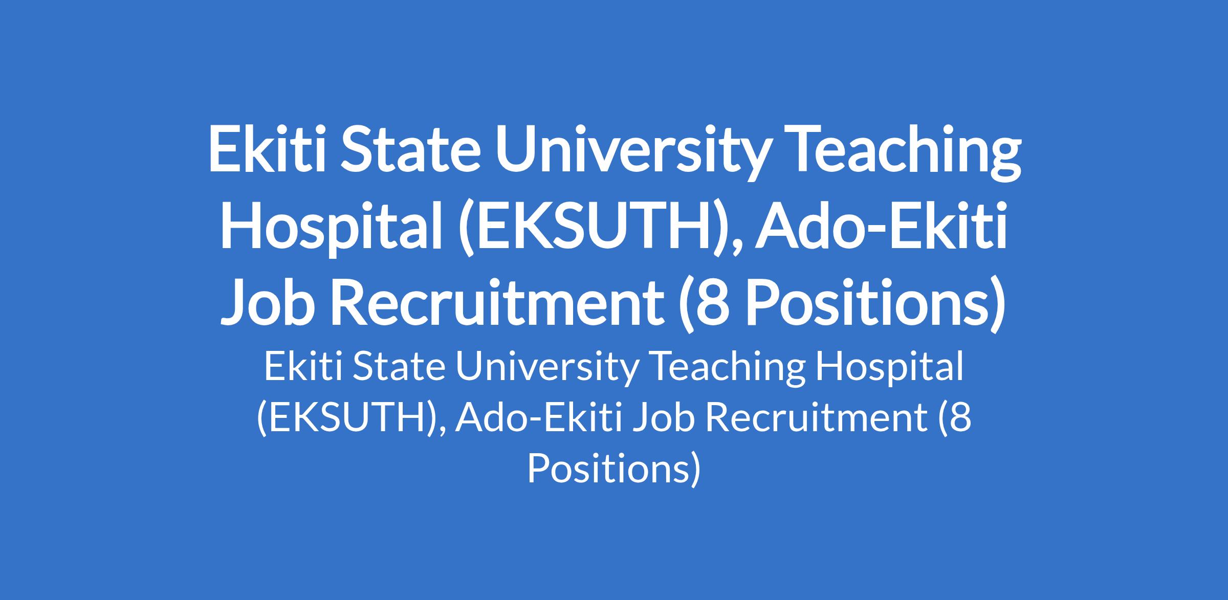 Ekiti State University Teaching Hospital (EKSUTH), Ado-Ekiti is recruiting suitably qualified candidates to fill the following positions in Ekiti State: Registrar, Obstetrics and Gynaecology (O&G); Registrar, Paediatrics; Registrar, Internal Medicine; Registrar, Surgery; Registrar, Radiology; Registrar, Anaesthesia; Registrar, Ophthalmology; and Registrar, Dentistry.