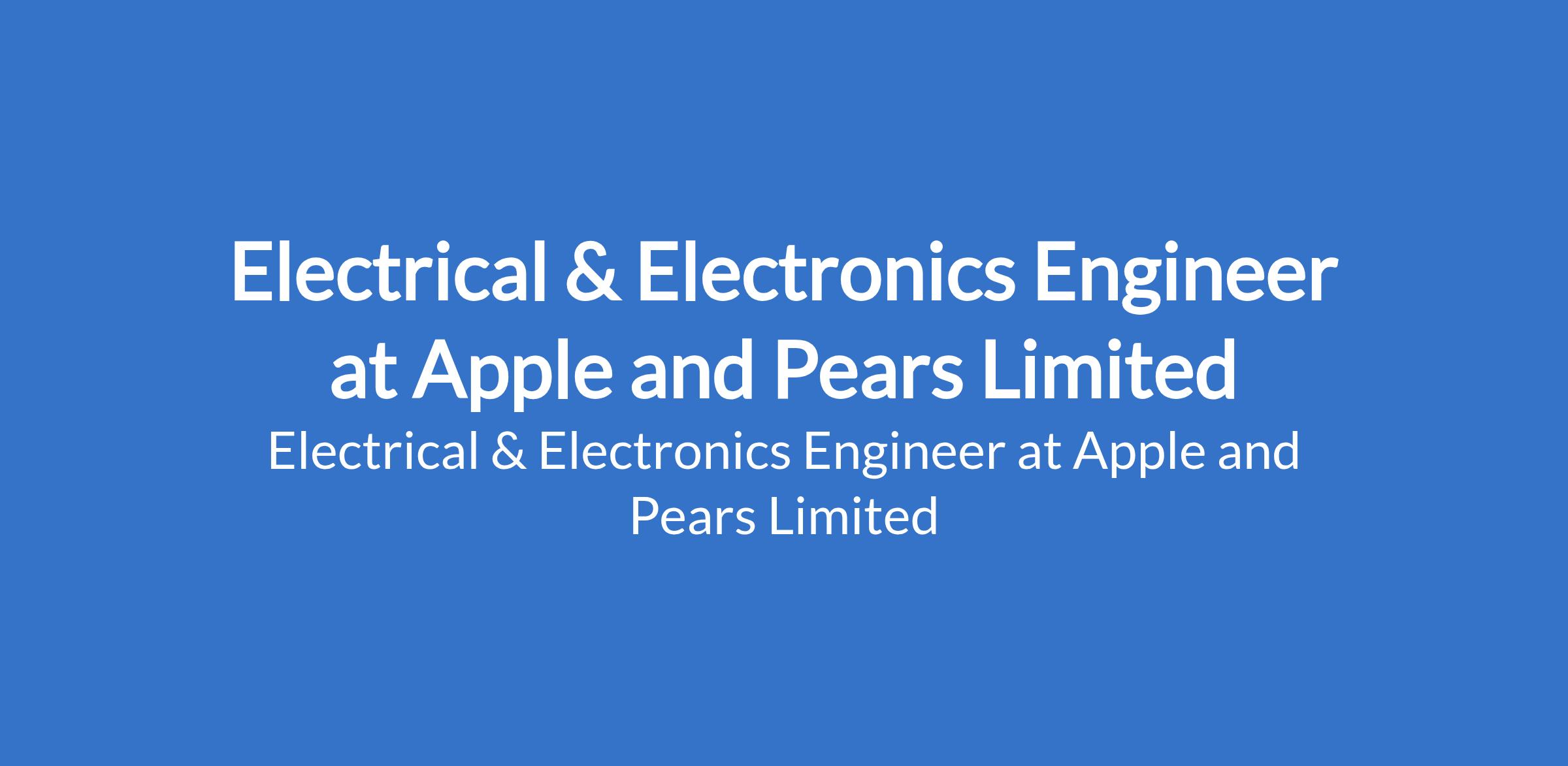 Apple and Pears Limited is recruiting to fill the position of: Electrical & Electronics Engineer. The position is located in Sagamu, Ogun State. Salary: N200,000 - N250,000 monthly. Interested candidates should possess a minimum of HND / B.Sc Degree in Electrical Engineering, Electronics Engineering, or a related discipline with a minimum of 35 years work experience in an Electrical & Electronics Engineer role within the FMCG or food manufacturing industry. Candidates must reside in Sagamu, Ogun State or nearby environs.