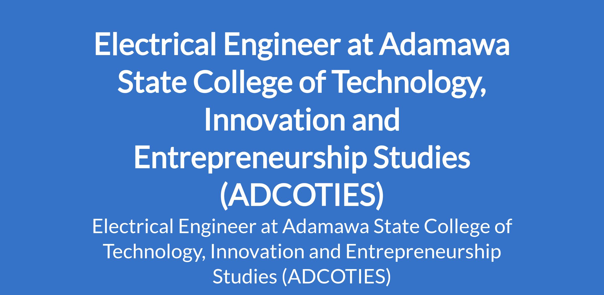 Adamawa State College of Technology, Innovation and Entrepreneurship Studies (ADCOTIES) is recruiting to fill the position of: Electrical Engineer. The position is located in Gulak, Adamawa State. Interested candidates should possess a Bachelor's Degree with a minimum of Second Class Lower from a recognised Institution plus NYSC discharge or exemption.