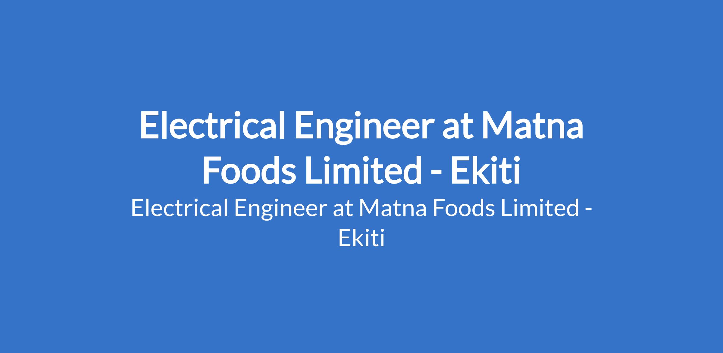Matna Foods Limited is recruiting to fill the position of: Electrical Engineer. The position is located in Ekiti State. Interested candidates should possess a B. Sc or HND in Electrical / Electronic Engineering or a related technical field with a minimum of 5 years experience in an industrial manufacturing environment.