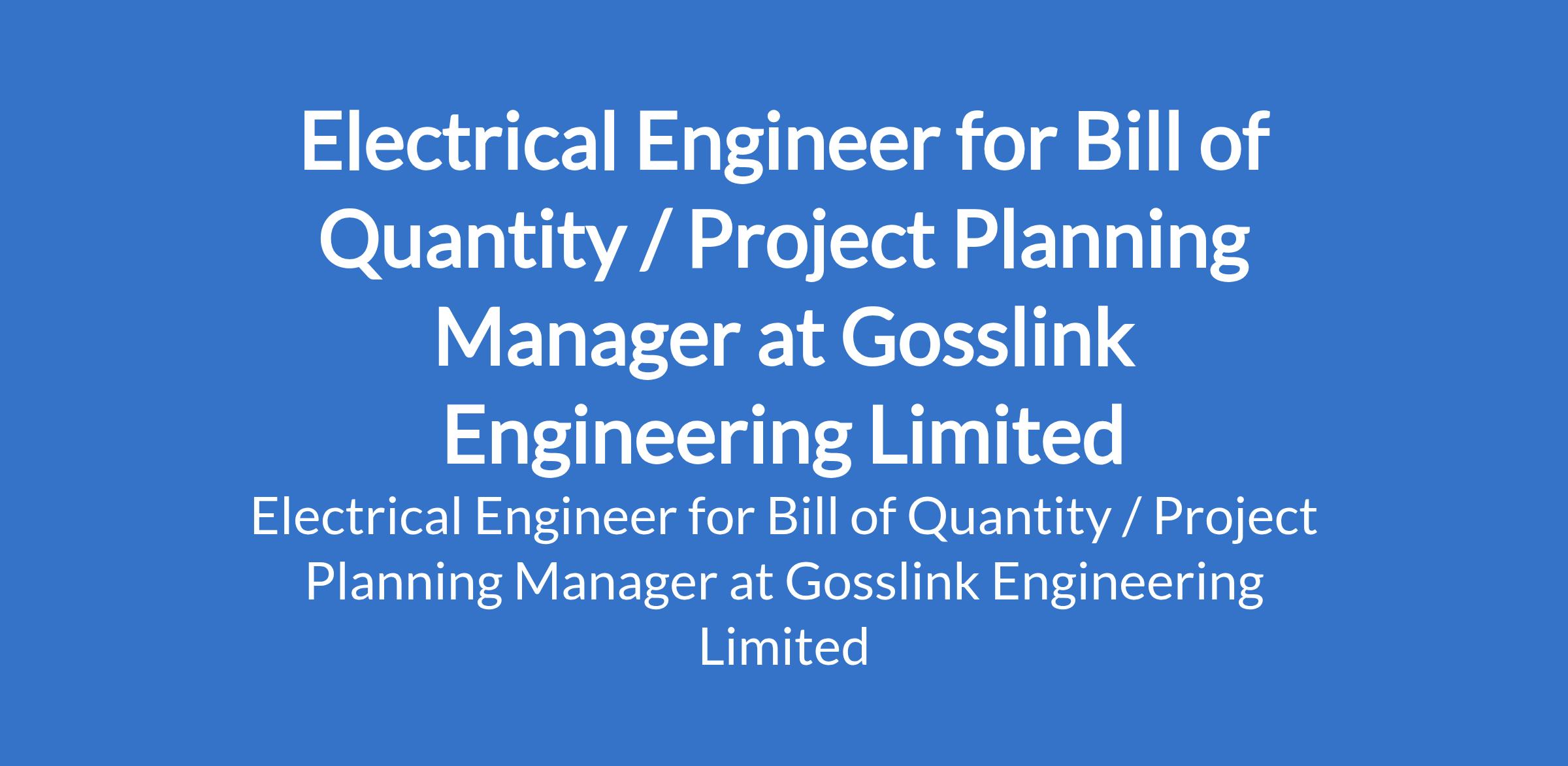 Gosslink Engineering Limited is recruiting to fill the position of: Electrical Engineer for Bill of Quantity / Project Planning Manager. The position is located in Lagos State. Interested candidates should possess a B.Sc / HND in Electrical Engineering, or a related field with 46 years experience in electrical / power engineering projects.