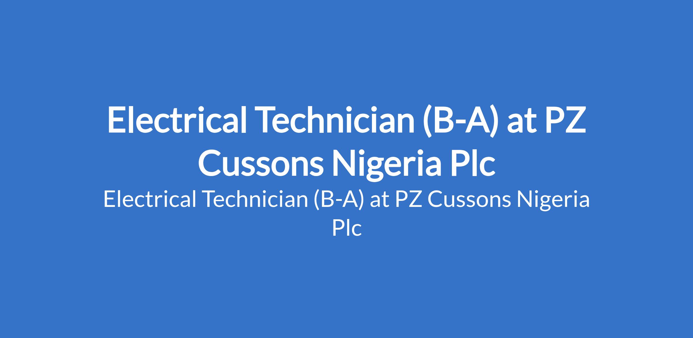 PZ Cussons Nigeria Plc is recruiting to fill the position of: Electrical Technician (B-A). The position is located in Aba, Abia State. Interested candidates should possess an OND / HND / BSc Degree in Electrical / Electronics Engineering with a minimum of 3 years work experience in a similar position.