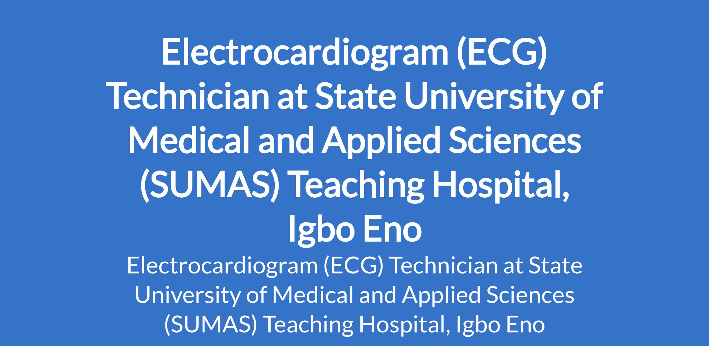 State University of Medical and Applied Sciences (SUMAS) Teaching Hospital, Igbo Eno invites applications from suitable candidates for the position of: Electrocardiogram (ECG) Technician. The position is located in Enugu State. Interested candidates should have completed the prescribed 3 years training programme at the School of Health Technology and obtained the Registration of Institute of Medical Laboratory Technology of Nigeria for Technicians cadre