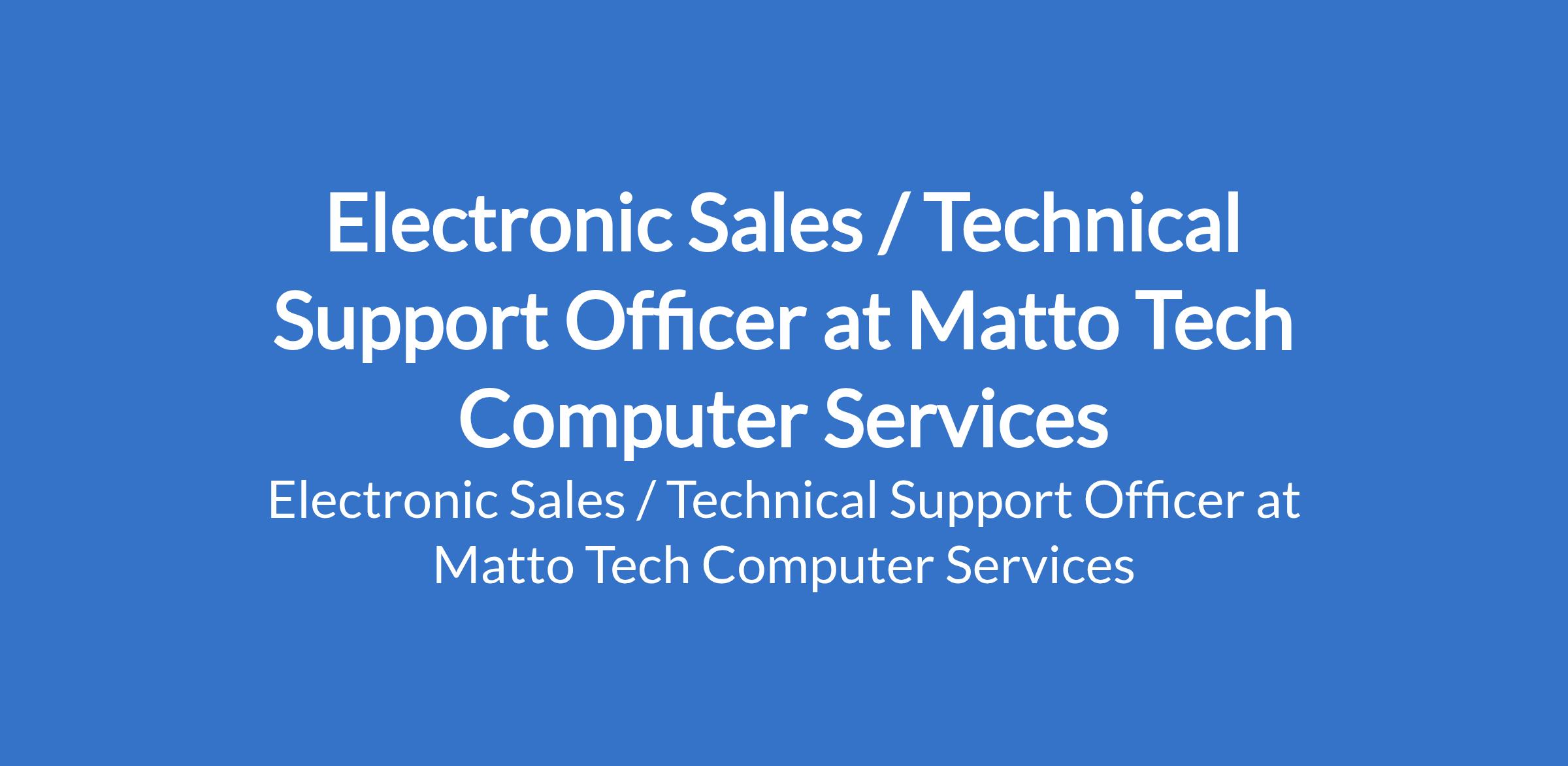 Matto Tech Computer Services is recruiting to fill the position of: Electronic Sales / Technical Support Officer. The position is located in Lagos State. Salary: N100,000 - N150,000 per month. Interested candidates should possess a minimum of SSCE / OND (additional technical certification is an advantage).