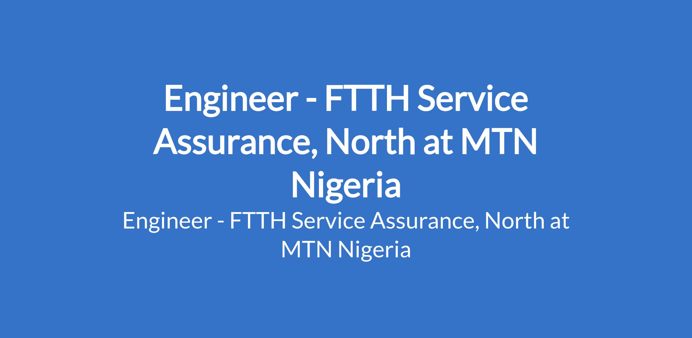 MTN Nigeria is recruiting to fill the position of: Engineer - FTTH Service Assurance, North. The position is located in Maitama, Abuja. Interested candidates should possess a Bachelor`s Degree in Telecommunications, Electrical / Electronics / Computer Engineering Project Management, or related fields with 3 - 7 years experience.