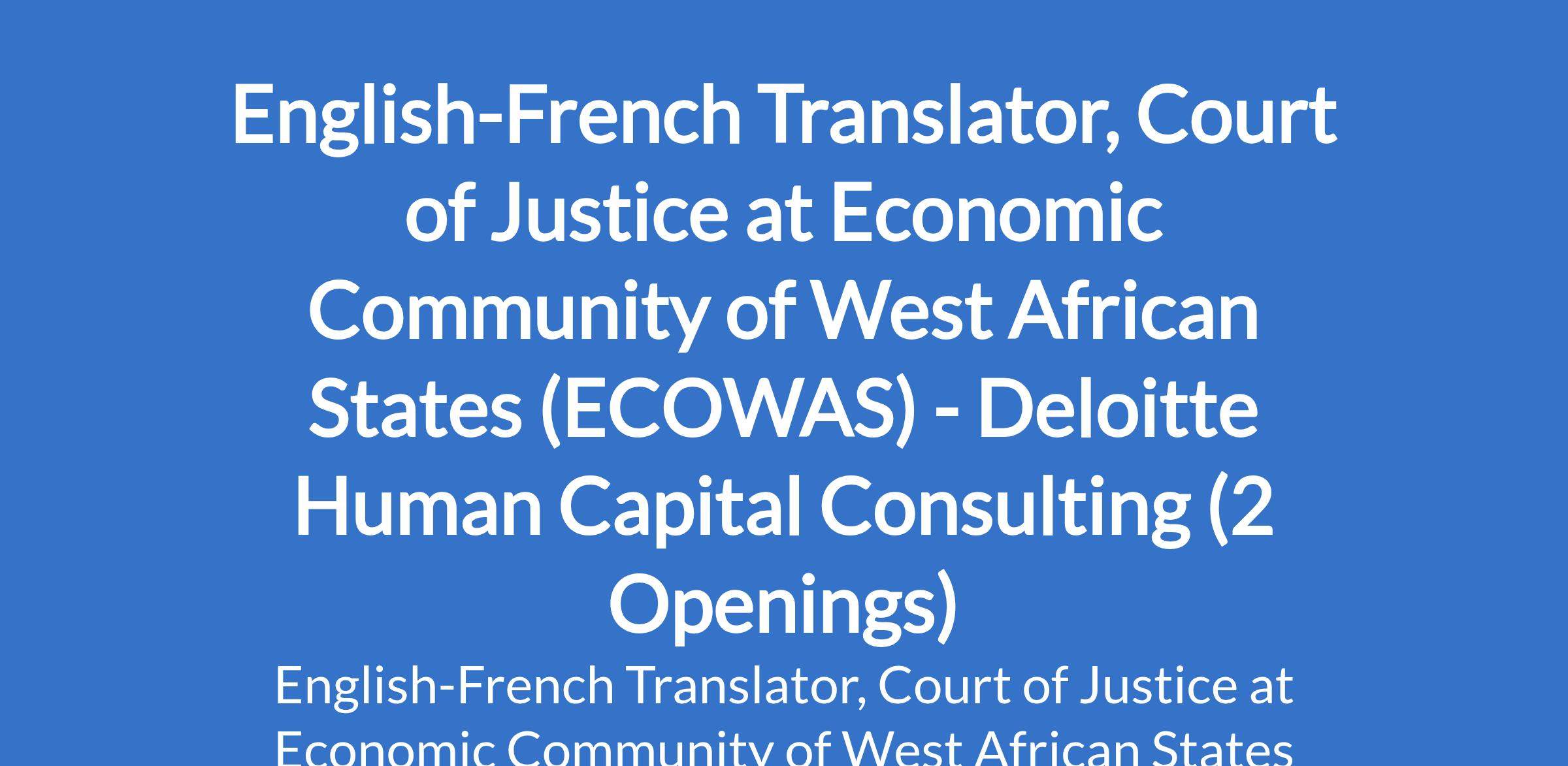 Deloitte Human Capital Consulting - Our client, Economic Community of West African States (ECOWAS) is recruiting to fill the position of: English-French Translator, Court of Justice. The position is located in Abuja. Salary: UAC 66,123.98/ USD 104,330.42 annually. Interested candidates should possess a Master`s Degree completed by a Diploma or a Certificate in Conference Interpretation issued by a recognized institution or a university Degree in conference interpretation awarded by a recognized institution with ten years of experience in interpretation (including four years as a permanent interpreter).