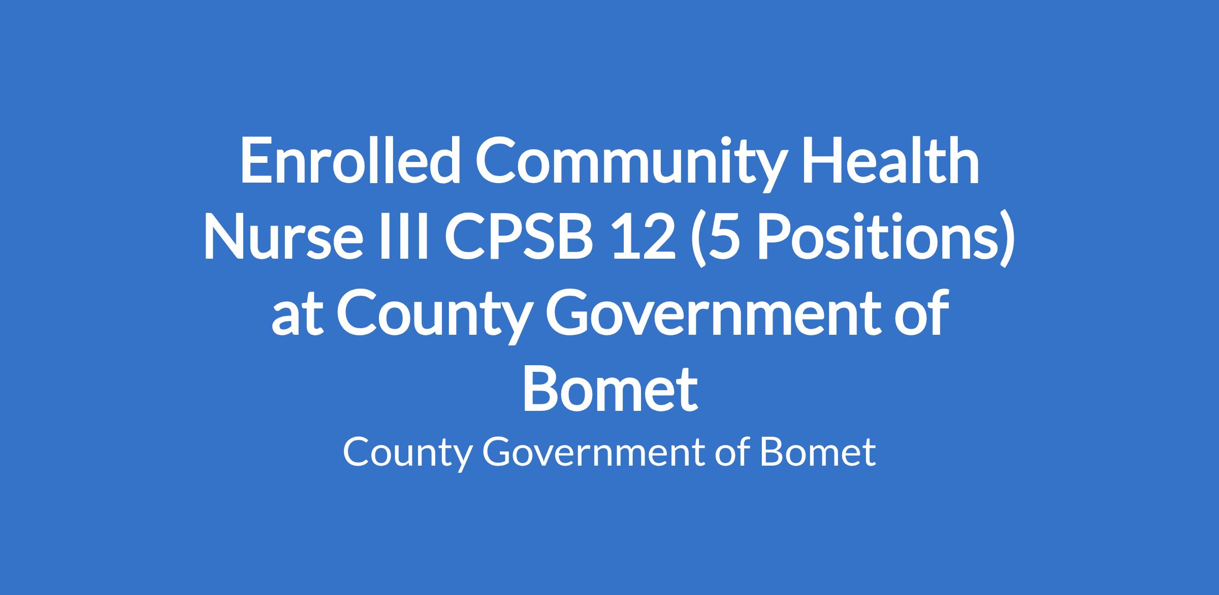 Certificate in any of the following disciplines: Kenya Enrolled Nurse, Kenya Enrolled Community Health Nurse, Kenya Enrolled Midwife, Kenya Enrolled Psychiatric Nurse or Enrolled Nurse/Midwife from a recognized training institution;